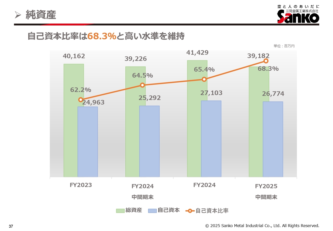 自己資本は、前事業年度末比3.3億円減少の267億円となりました。自己資本比率は、総資産22.5億円減少、純資産3.3億円減少により、前事業年度末65.4パーセントから2.9パーセント上昇の68.3パーセントとなりました。