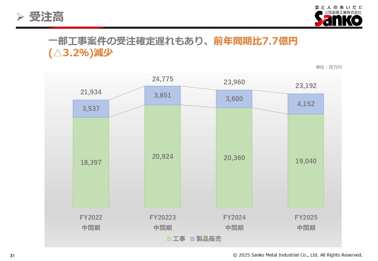 受注高については、一部工事案件の受注確定遅れもあり、前年同期比3.2パーセント減の231億円となりました。