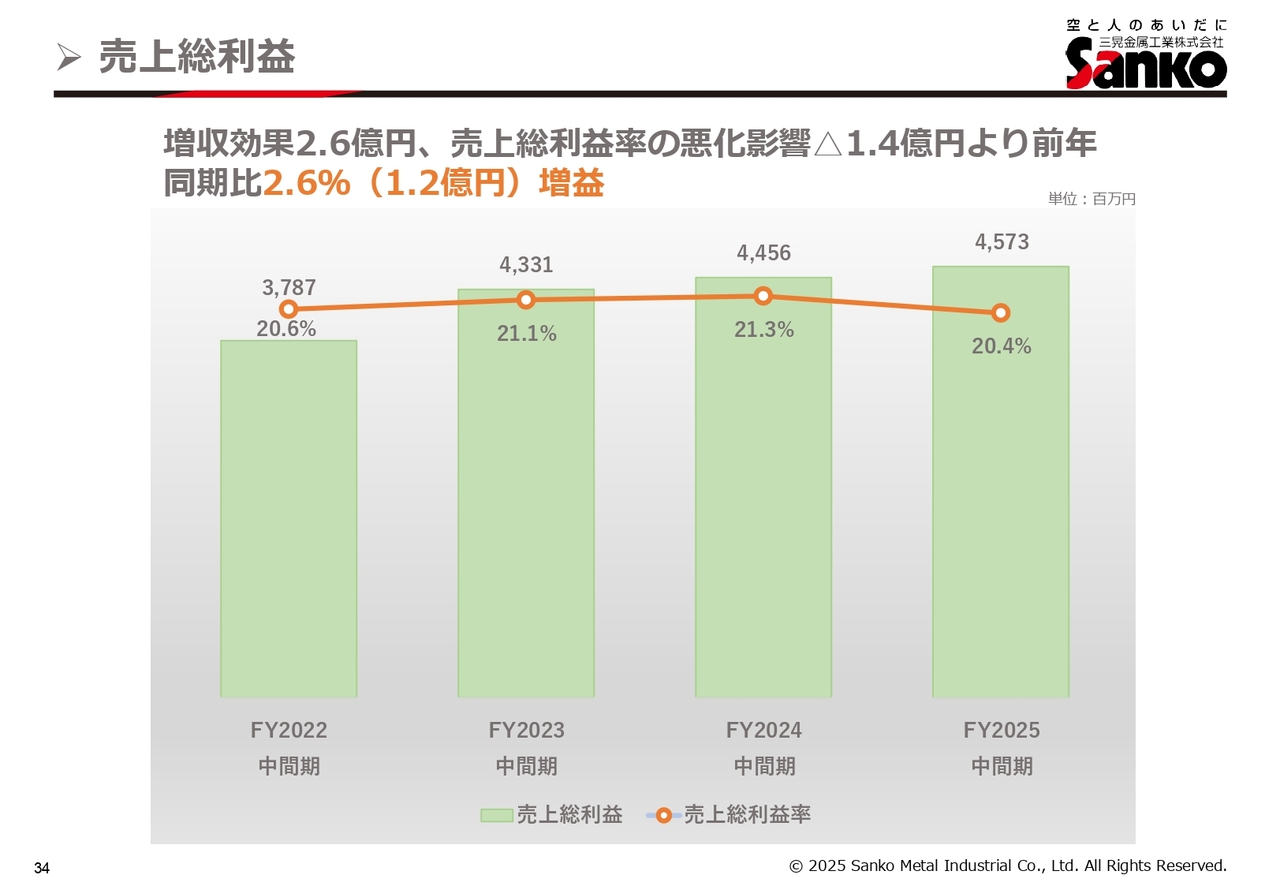 売上総利益については、増収効果2.6億円、売上総利益率悪化影響で1.4億円減となり、前年同期比2.6パーセント増益の45億円となりました。
