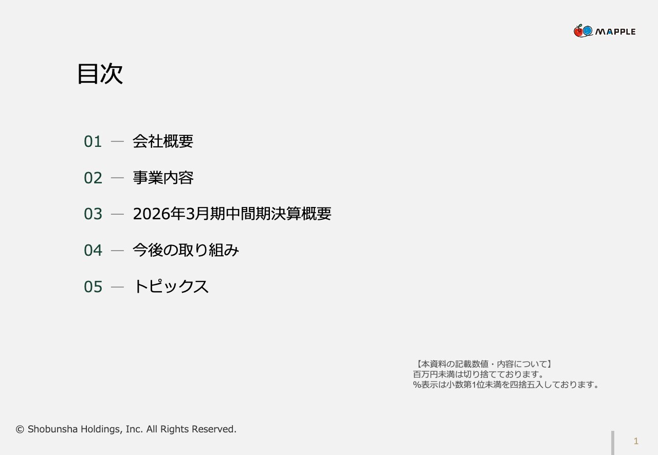 最初に会社概要をご説明し、次に事業内容をご紹介します。続いて、2026年3月期中間期決算の概要をお伝えし、今後の取り組みとして「経営アクションプラン」などの内容をご紹介します。最後に、トピックスとして当社グループの最新動向についてご説明します。