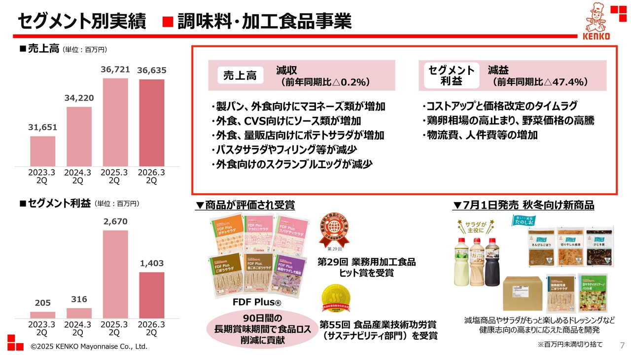 セグメント利益については、売上高の減少に加え、コスト上昇に対応する価格改定にタイムラグが生じたことや、鶏卵相場の高止まり、野菜価格の高騰による原材料費の増加、さらに物流費や人件費等の増加が影響し、前年同期比マイナス47.4パーセントとなりました。