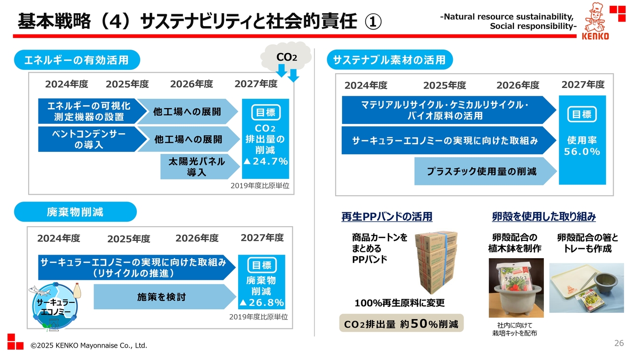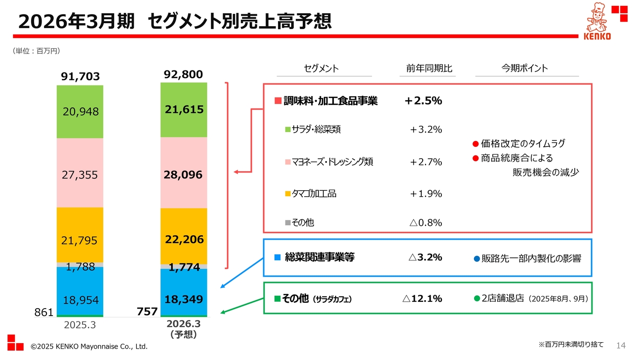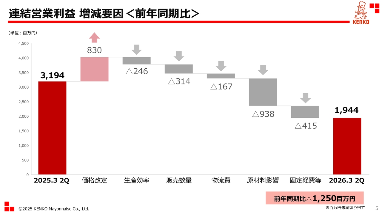 2025年4月より実施した価格改定の効果は8億3,000万円でした。生産効率については、販売数量の減少に伴う工場稼働率の低下が影響し、マイナス2億4,600万円となりました。販売数量の減少は、タマゴ加工品やサラダ・総菜類の採用メニュー商品の減少などが要因で、マイナス3億1,400万円となりました。