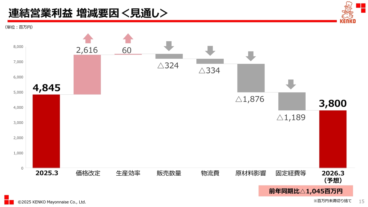 原材料費の影響については、鶏卵相場の高止まりにより、18億7,600万円のマイナスを見込んでいます。固定経費等では、人件費、海外戦略費用、東京本社移転費用といった将来への投資費用を計画しており、11億8,900万円のマイナスを見込んでいます。