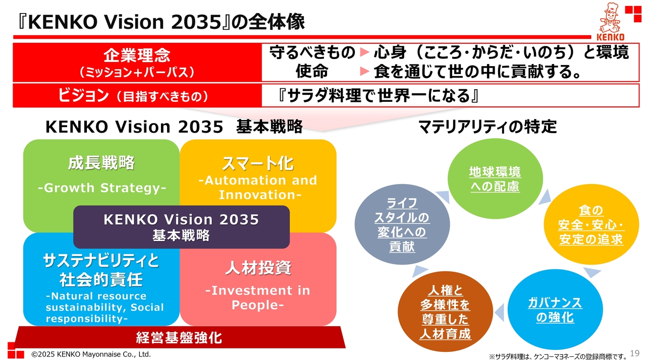 こちらが『KENKO Vision 2035』の全体像です。理念体系を再構築し、重要課題を見直し、マテリアリティの特定を行っています。