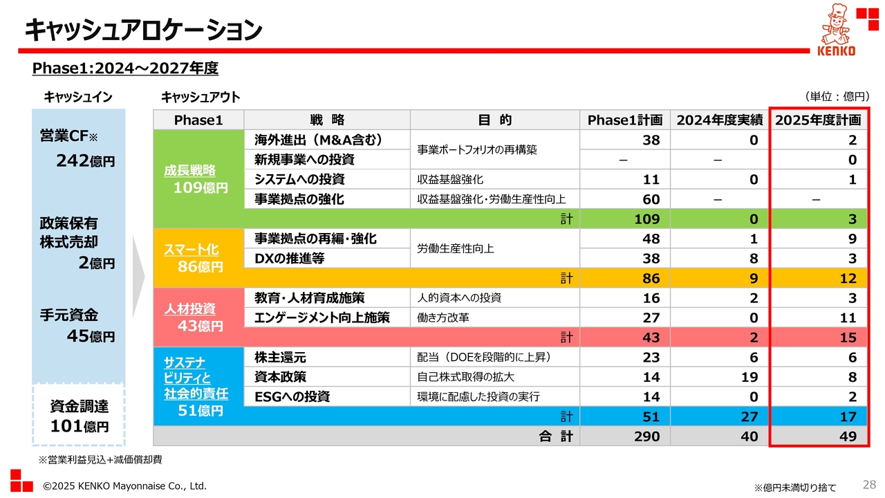 一方、キャッシュアウトは、中長期経営計画の4つの基本戦略を推進するため、合計290億円を計画しています。特に2025年度は、事業拠点の再編・強化やエンゲージメント向上等への投資として、合計49億円を見込んでいます。