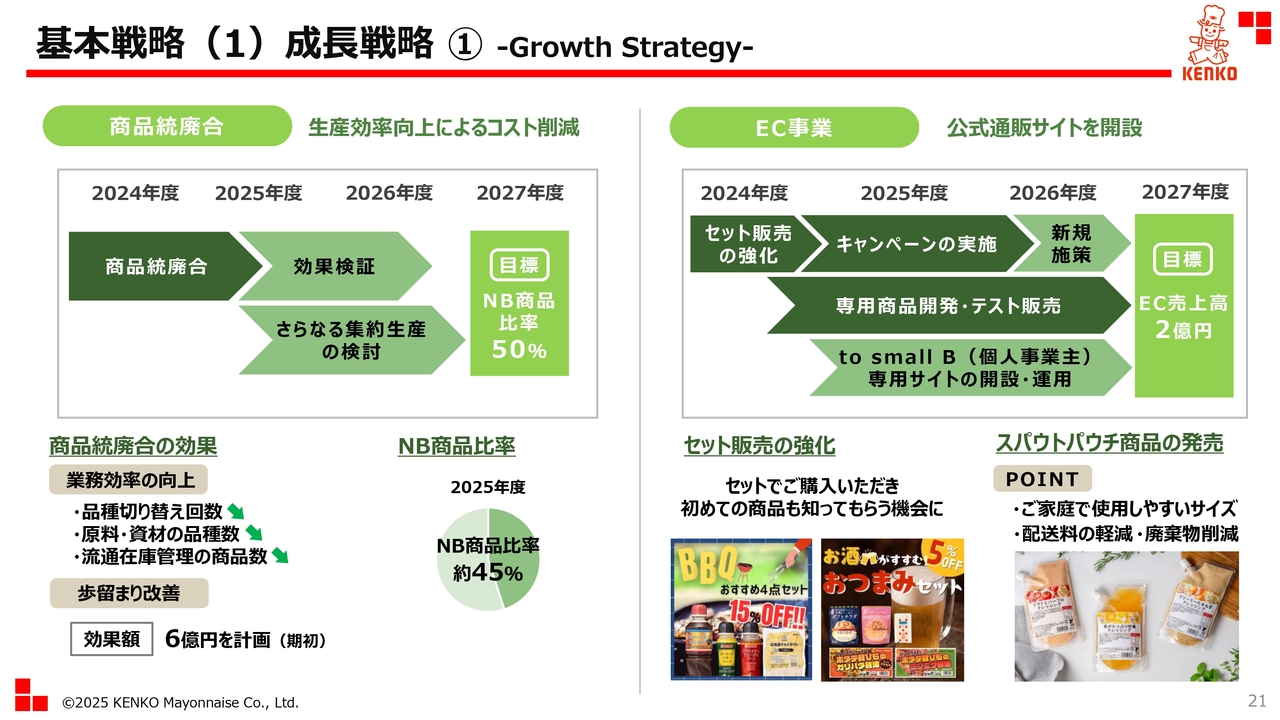 NB商品比率の向上については、基盤商品のブランド強化と認知度の向上を目指しています。2027年度のNB商品比率目標50パーセントに対し、2025年度第2四半期の段階で約45パーセントとなっています。