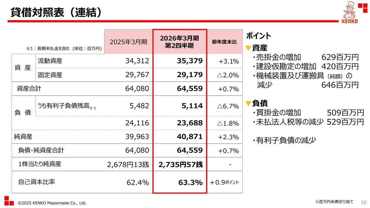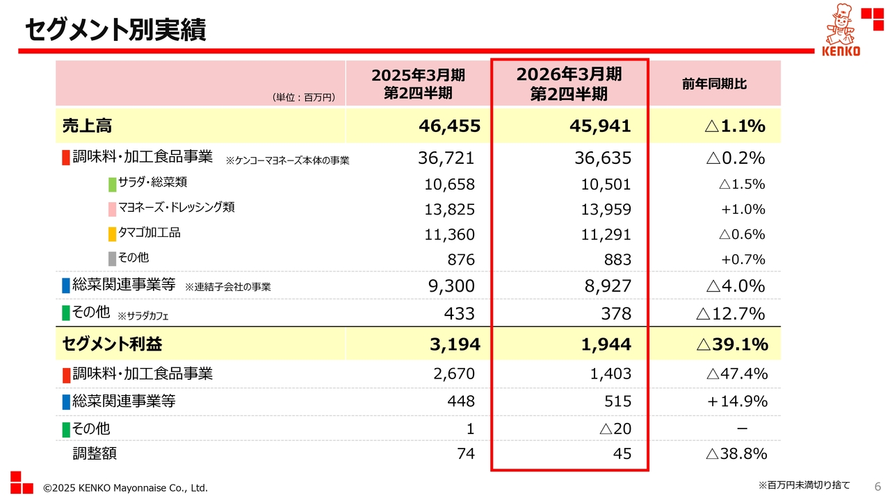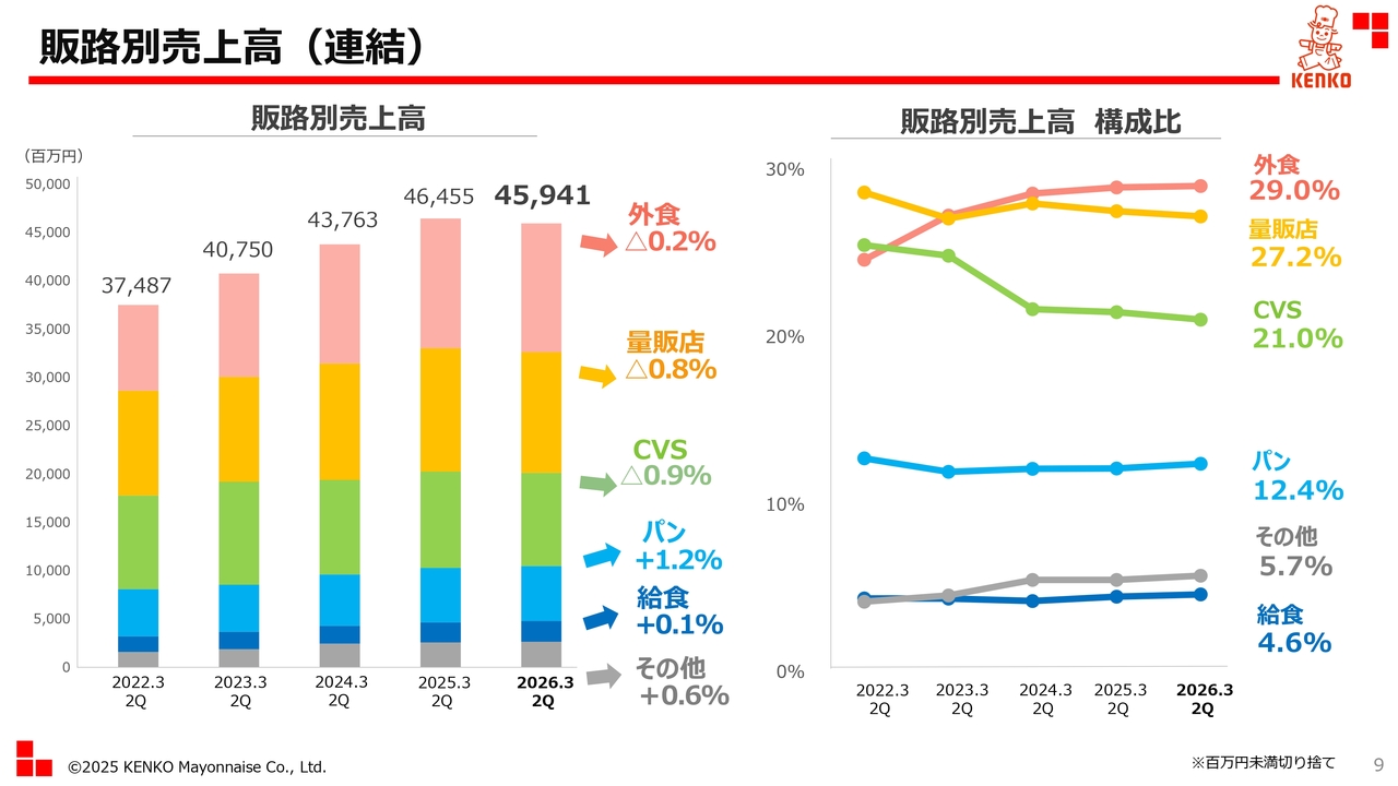 2026年3月期第2四半期の連結売上高は459億4,100万円、連結営業利益は19億4,400万円となり、いずれも前年同期比で減収減益となりました。売上高は、マヨネーズ・ドレッシング類が伸長したものの、昨年度採用されていたタマゴ加工品やサラダ・総菜類の減少、商品統廃合による販売機会の減少により、前年同期比で1.1パーセントの減収となりました。