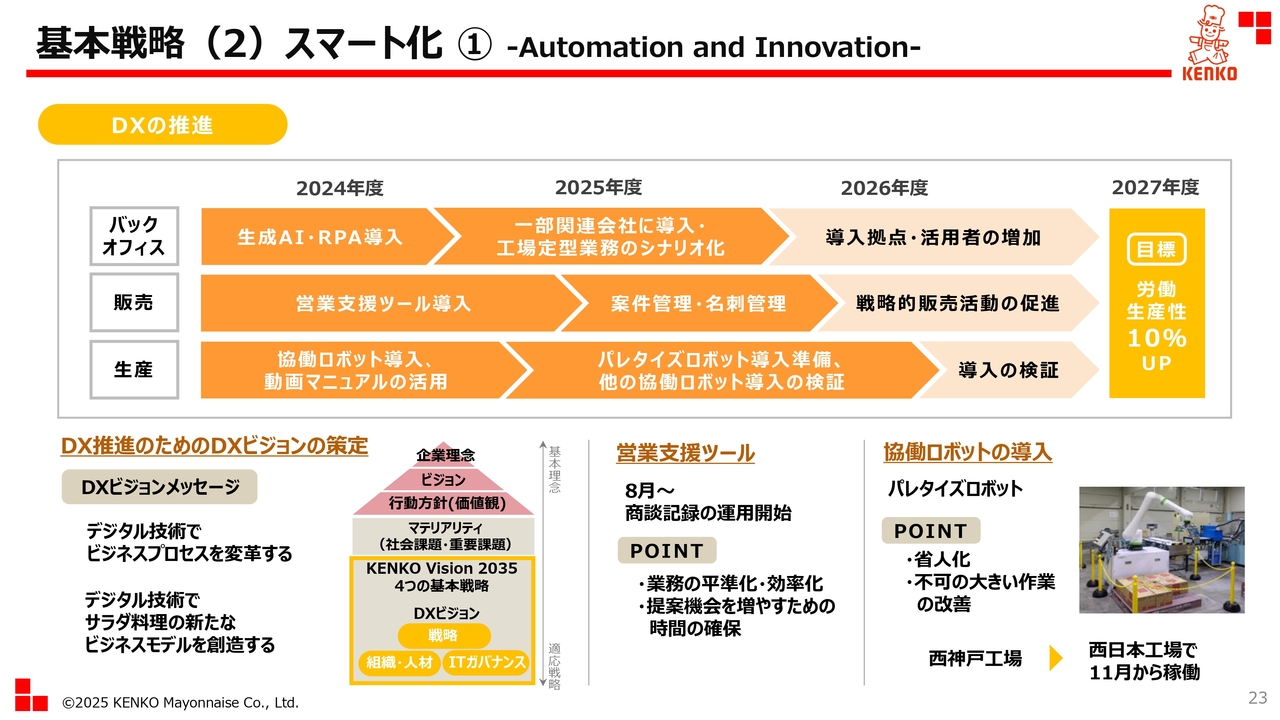 生成AIやRPAの導入、営業支援ツールの活用、協働ロボットの導入など、さまざまなデジタル技術を活用し、2027年度には2024年度比で労働生産性10パーセントアップを目指します。