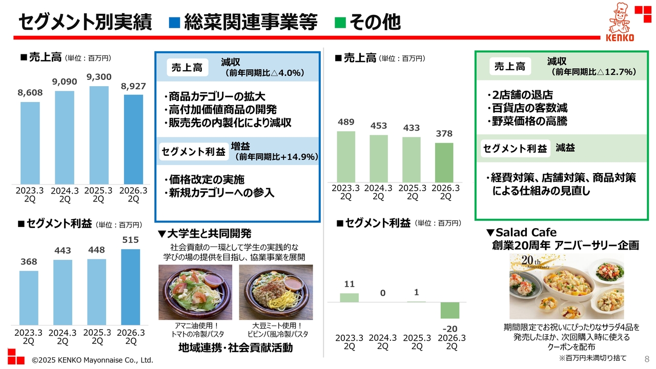 利益に関しては、価格改定の効果や新規カテゴリへの参入により、前年同期比プラス14.9パーセントの増益となりました。「Salad Cafe」のショップ事業を含むその他では、2025年8月と9月に実施された2店舗の退店や野菜価格の高騰が影響し、減収減益となりました。