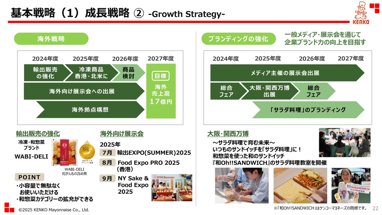 海外戦略では、輸出販売の強化に取り組んでいます。冷凍の和惣菜ブランド「WABI-DELI」の提案強化と、海外向け展示会への出展に注力した結果、海外売上高は順調に伸長しています。