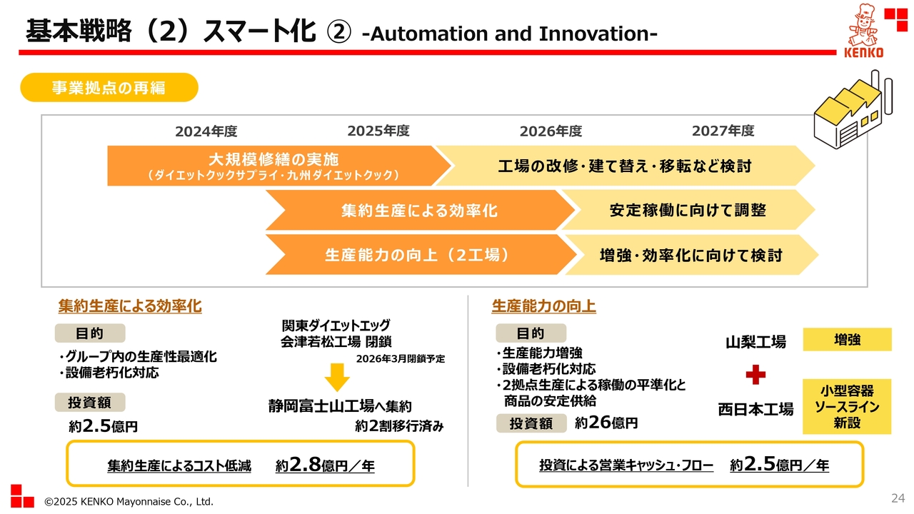 2つ目のテーマは、事業拠点の再編です。集約生産による効率化として、連結子会社である関東ダイエットエッグの会津若松工場で生産しているタマゴ加工品を静岡富士山工場に移行します。集約生産によるコスト低減により、年間2億8,000万円の効果を見込んでいます。
