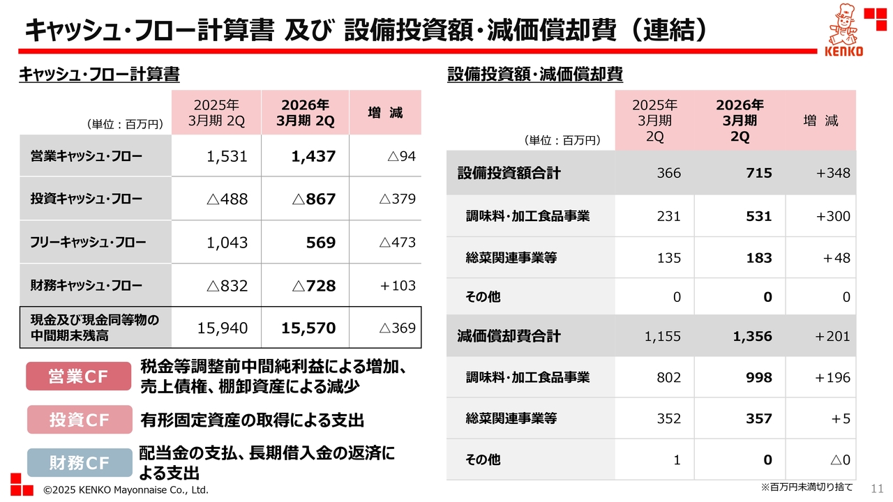 以上の結果、当第2四半期時点の現金及び現金同等物の中間期末残高は155億7,000万円となりました。減価償却費は、中長期経営計画の戦略に基づく生産設備への投資などにより、前年同期比2億100万円増加の13億5,600万円となりました。決算概要の説明は以上です。