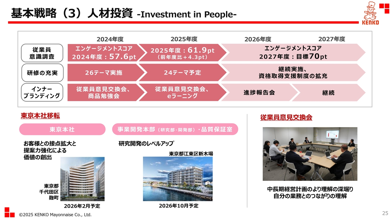 2025年度のエンゲージメントスコアは61.9ポイントで、前年度から4.3ポイント増加しました。従業員のエンゲージメントを把握し、課題を強みに転換するアクションプランを継続的に実行することで、さらなる向上を目指しています。研修の充実やインナーブランディングにも引き続き取り組んでいきます。