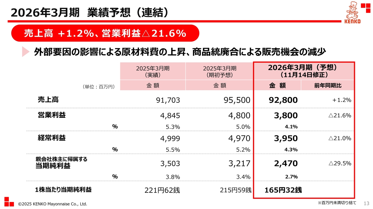 しかし、原材料費、人件費、物流費などのコスト増加要因に対し、販売価格への反映が遅れており、今期中にこれらの増加費用を吸収することが困難な状況です。また、鶏卵相場の高止まりや商品統廃合による販売機会の減少などの影響により、売上高および利益が期初の予想を下回る見通しとなりました。