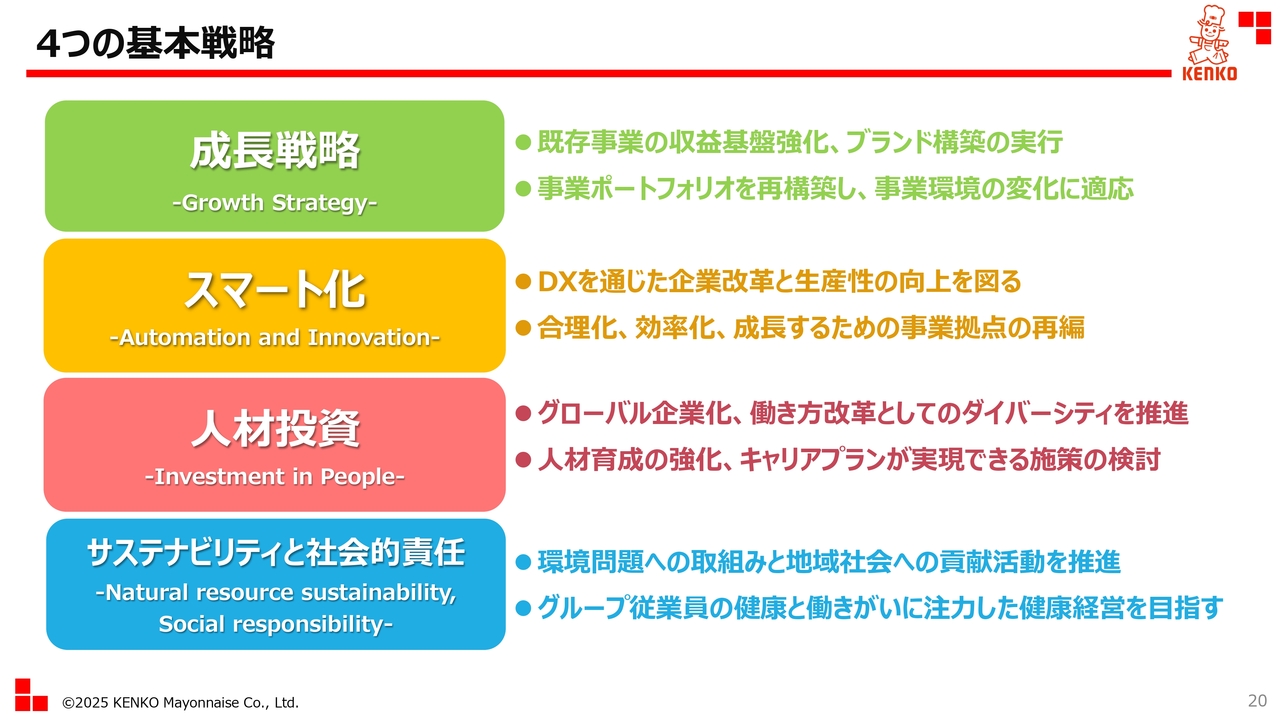 4つの基本戦略は、成長戦略、スマート化、人材投資、サステナビリティと社会的責任です。