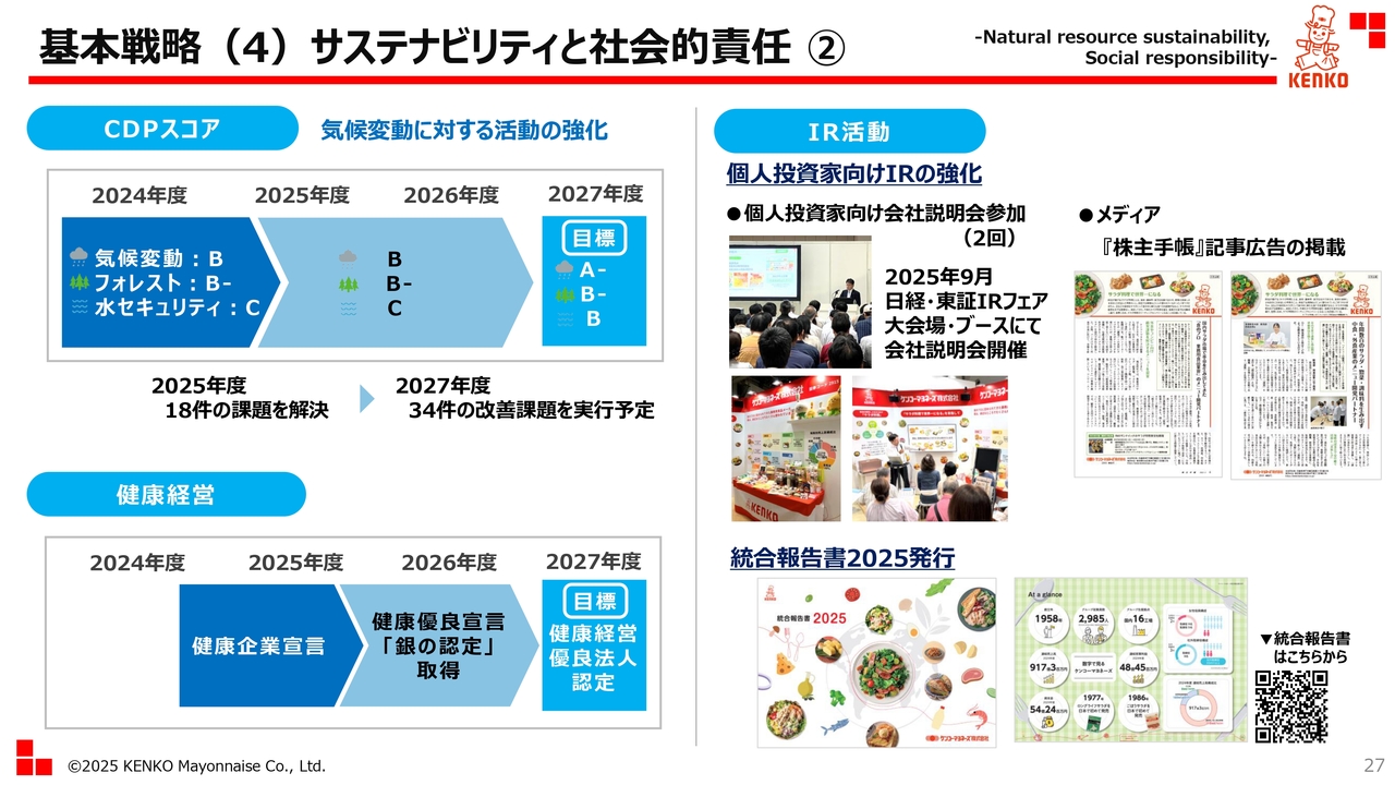 期初計画に対する業績予想は修正となりましたが、中長期経営計画『KENKO Vision 2035』で計画している2026年3月期の利益目標は達成できる見通しです。引き続き、収益力回復に向けた取り組みを継続し、中長期的な企業価値向上に努めていきます。