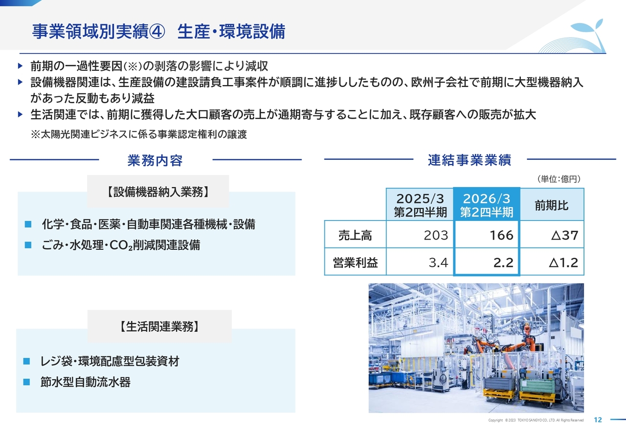 生産・環境設備の事業領域です。売上高は一過性要因の影響がなくなったことで前期比減収となりましたが、設備機器関連では生産設備の建設請負工事案件が順調に進捗しました。また、生活関連では、前期に獲得した大口顧客の売上が今期も寄与したことに加え、既存顧客への販売も拡大しました。