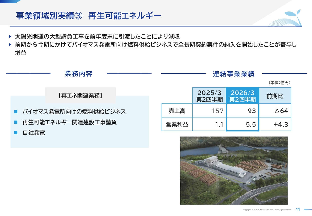 再生可能エネルギー事業領域についてです。太陽光関連の大型建設請負工事を前年度末に引き渡したことで減収となりましたが、請負工事関連損益の改善に加え、バイオマス発電所向けの燃料供給ビジネスで、今期より受注済みのすべての長期契約案件が納入を開始したことにより、営業利益は前期比4億3,000万円増加し、大幅に改善されました。