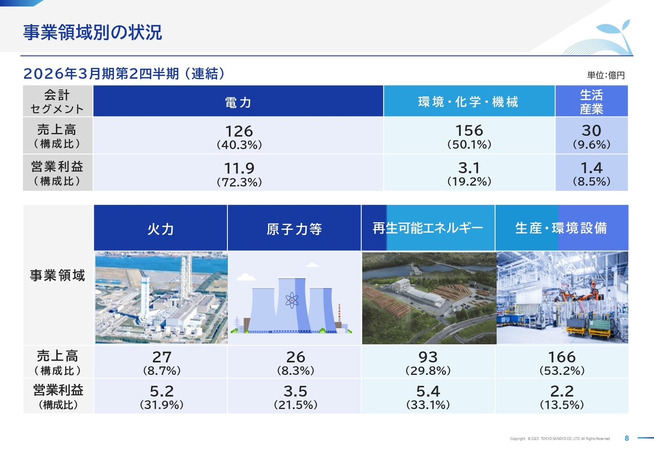 次に、事業領域別の状況をご説明します。事業領域と会計セグメントの関係は、スライドの8ページのとおりです。