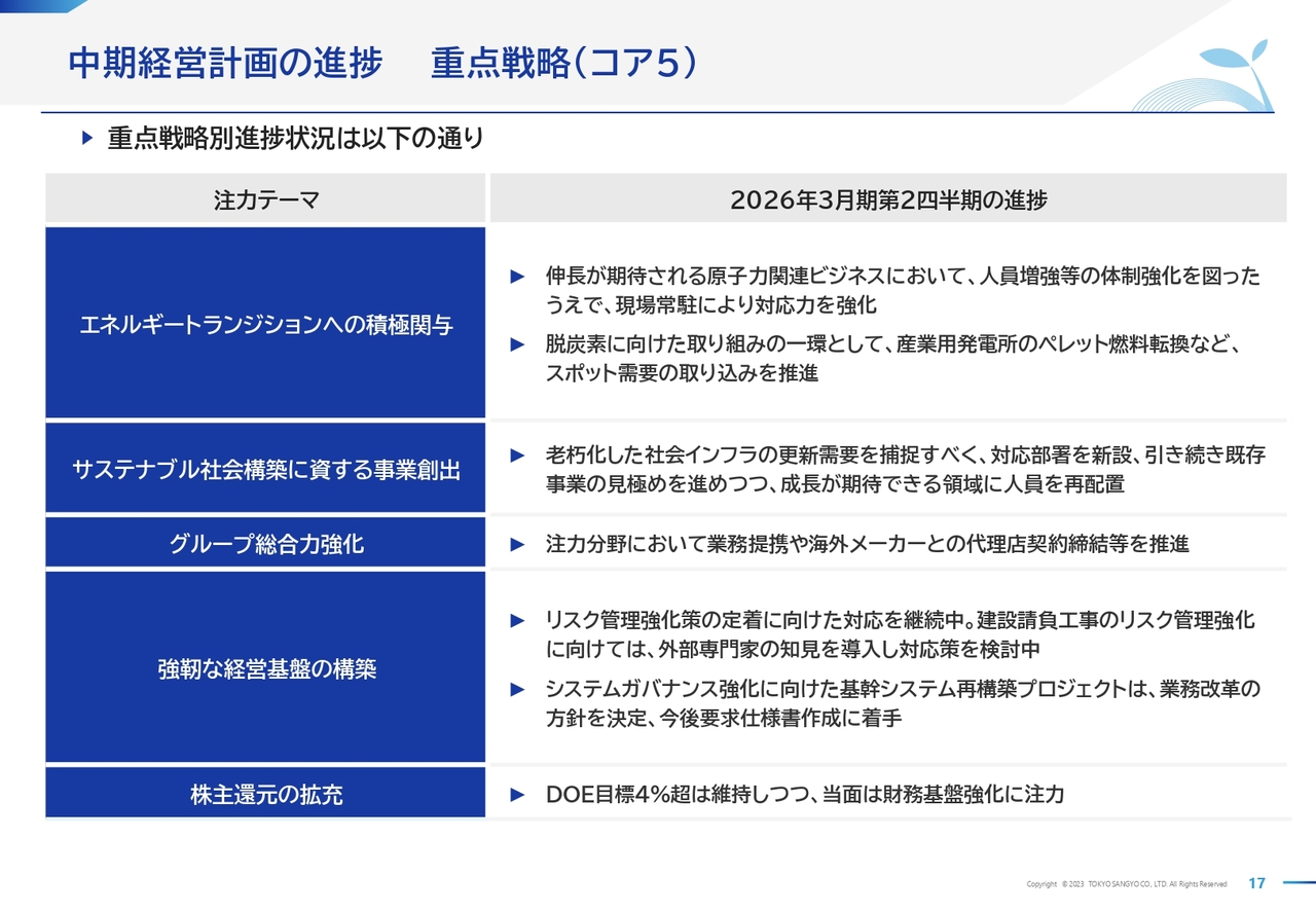 中期経営計画の重点戦略「コア5」の進捗についてご説明します。