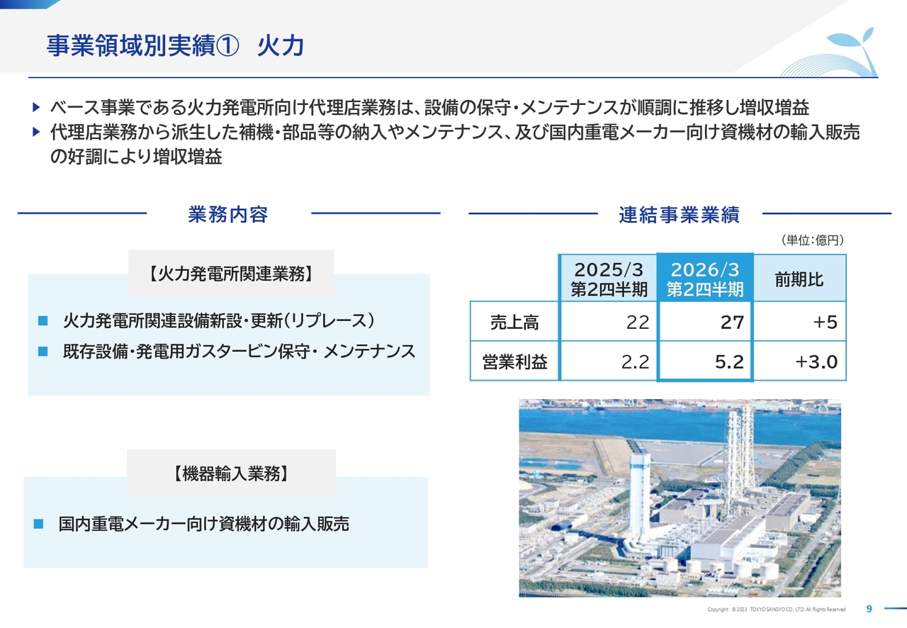 一方、損益面では、ベース事業である火力発電所向けの保守業務が順調に推移したことや、バイオマス発電所向け燃料供給ビジネスにおける長期契約案件の納入が開始されたことにより、増益となりました。