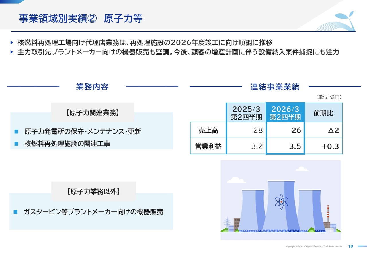 原子力関連業務では、核燃料再処理工場の2026年度内の竣工に向けた大規模な安全対策工事などの代理店業務が好調で、これらの工事に伴う派生取引も堅調に推移しました。