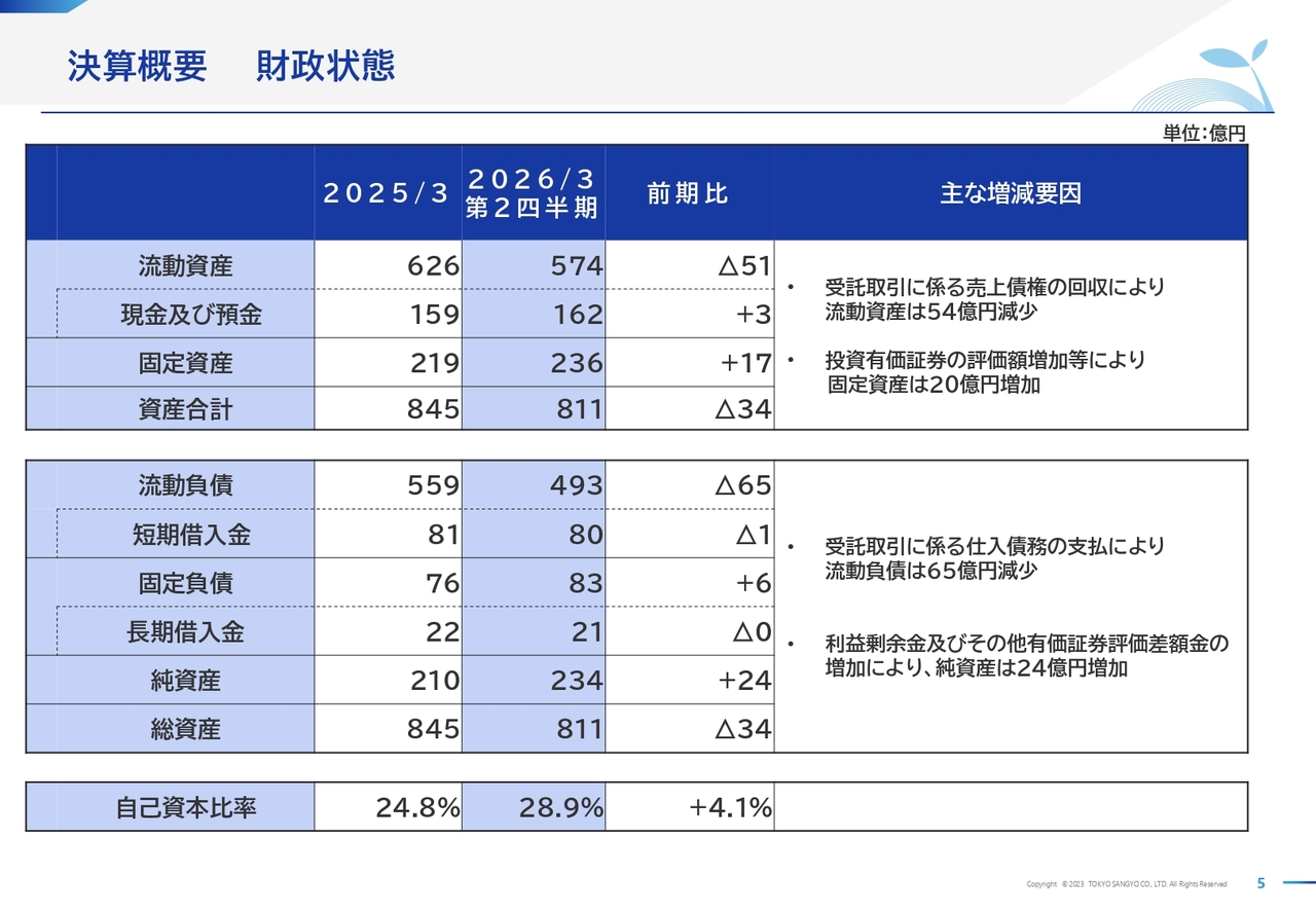 次に、財政状態です。前期末に代理店業務である受託取引で積み上がった債権の回収および負債の決済が完了したことで、流動資産と流動負債はいずれも減少しました。固定資産の増加は、株高に伴う投資有価証券評価額の増加によるものです。