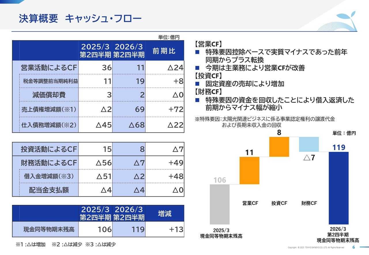 今期のキャッシュ・フローについて説明します。営業活動によるキャッシュ・フローは11億円のプラスとなりました。前期は事業認定権利の譲渡や長期未収入金の回収といった特殊要因を控除すると実質マイナスでしたが、資金負担のあった太陽光関連の建設請負工事が完工したことにより、今期は大幅に改善しました。