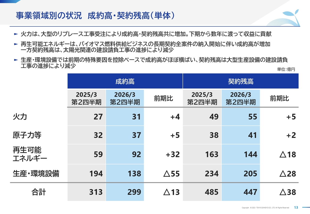 成約高・契約残高についてです。火力事業領域では、CO2排出量の少ない高効率発電設備への大型リプレイス工事を受注したことが寄与し、成約高・契約残高ともに前期比で増加しました。
