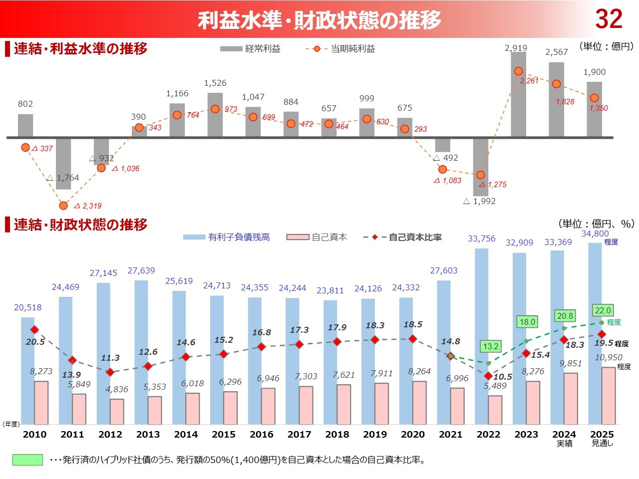 ウクライナ危機等により、2022年度の自己資本比率は10.5パーセントとなりましたが、その後は順調に自己資本を積み増しており、2025年度末の見通しは19.5パーセント程度となっています。