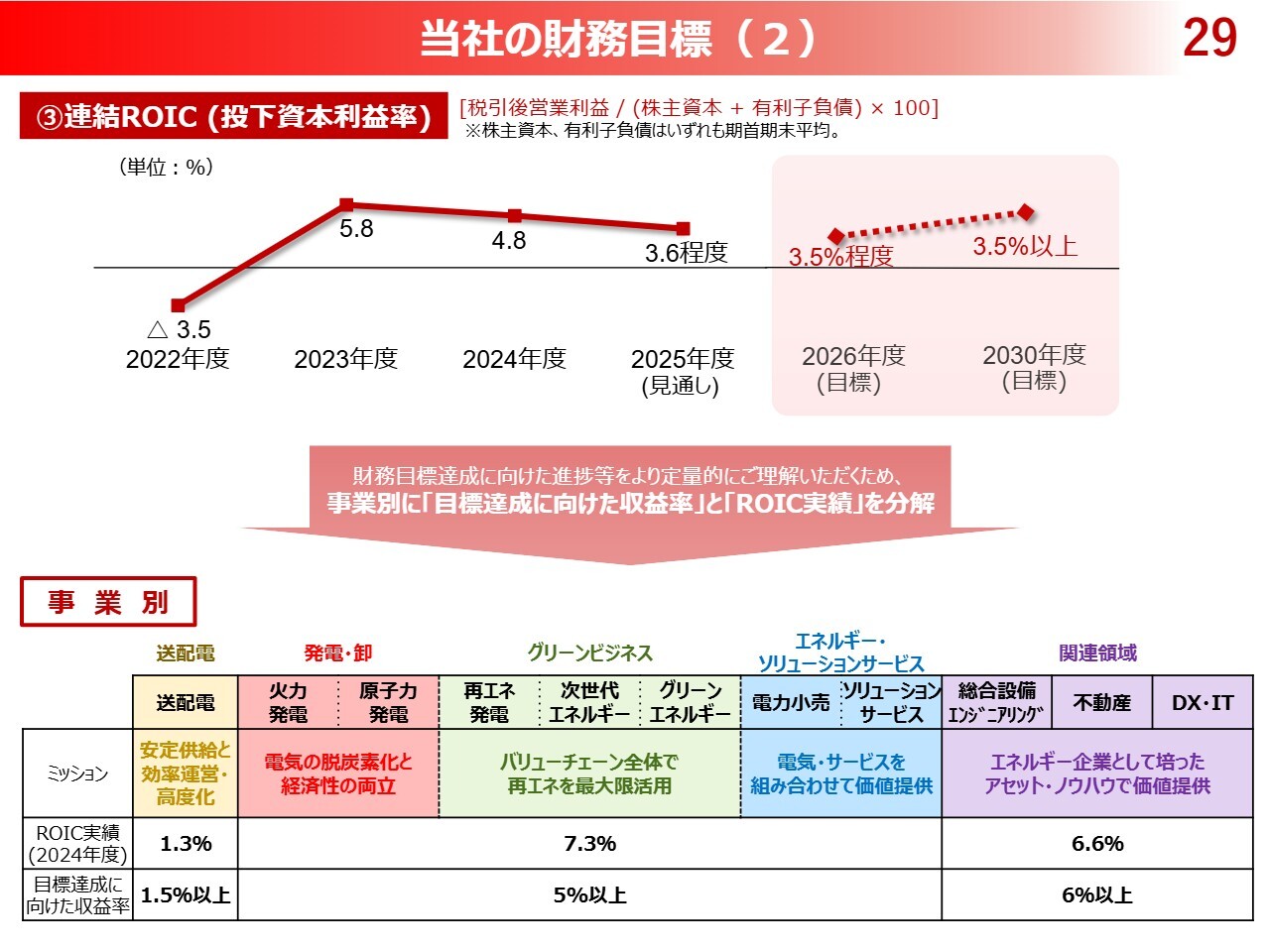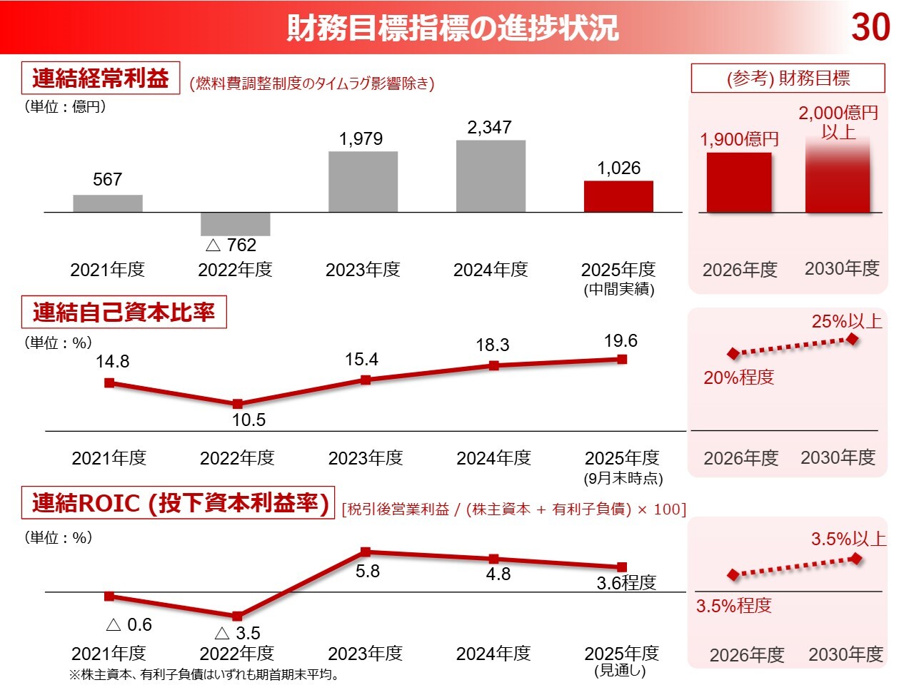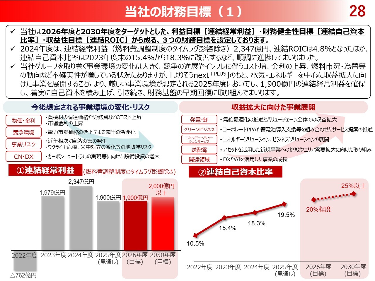 2024年度は、連結経常利益(燃料費調整制度のタイムラグ影響除き)2,347億円、連結ROICは4.8パーセントとなったほか、連結自己資本比率は2023年度末の15.4パーセントから18.3パーセントに改善するなど、順調に進捗してきました。