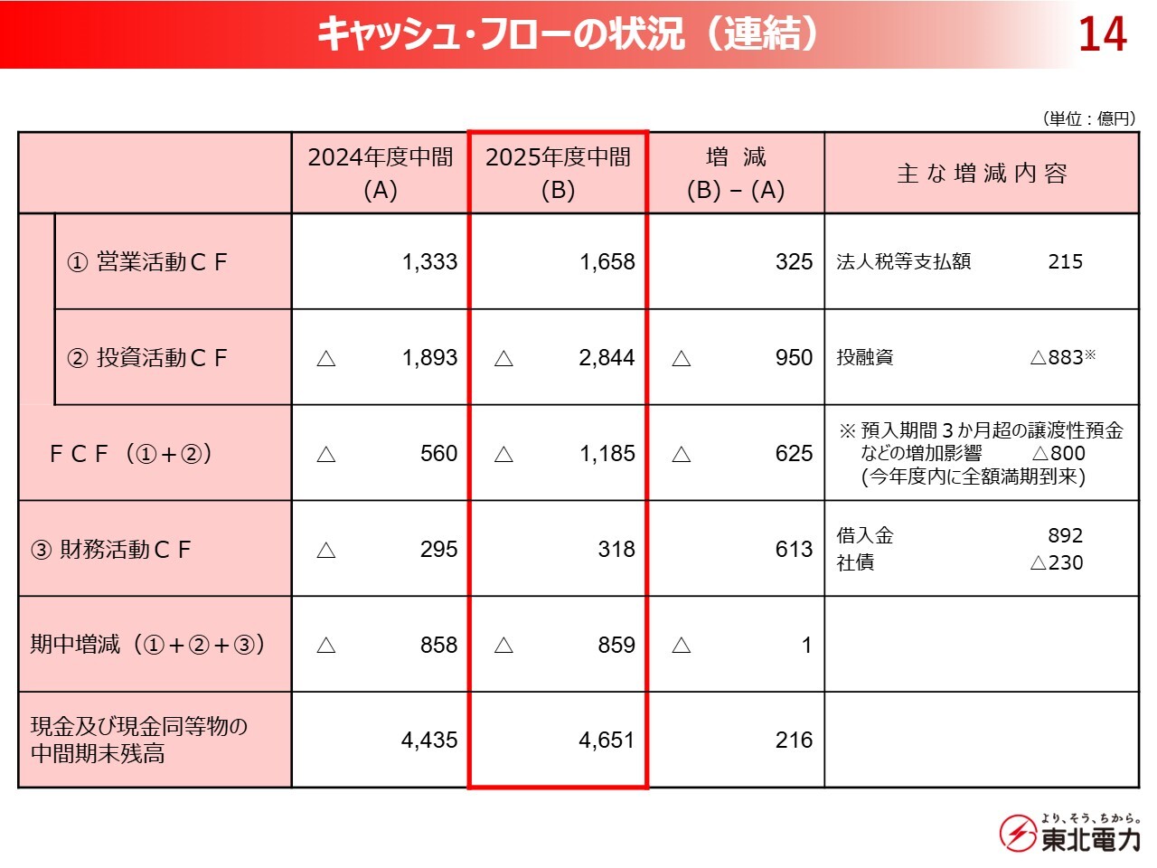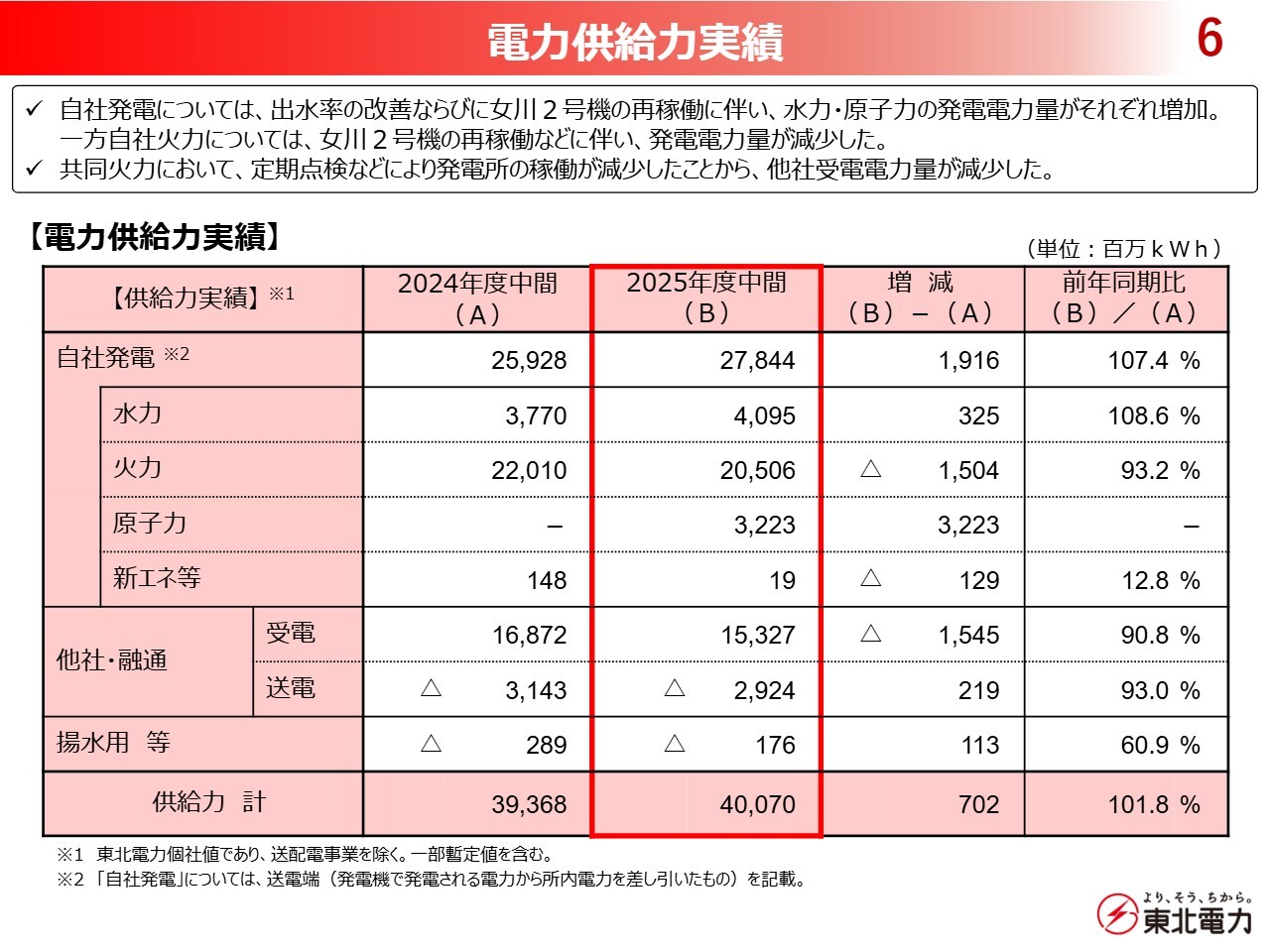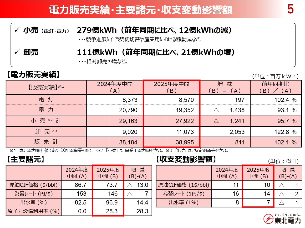 女川2号機の再稼働効果350億円や、燃料費調整制度のタイムラグ影響による差益の増加150億円などの収支改善があったものの、市場・販売環境の変化マイナス290億円や、送配電事業マイナス247億円などにより収支は悪化しました。