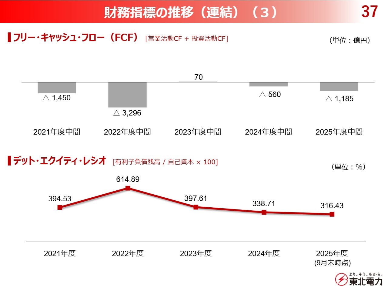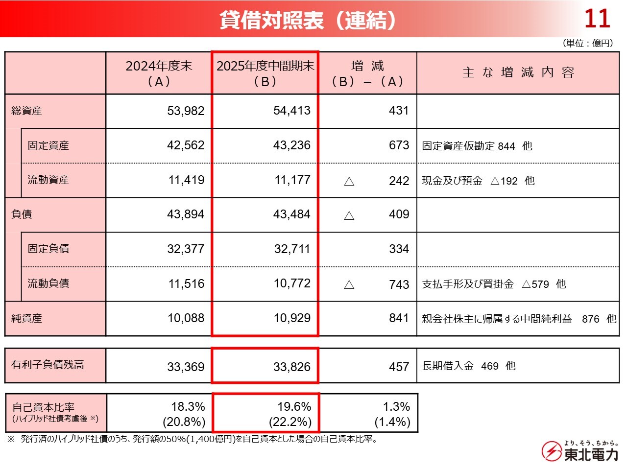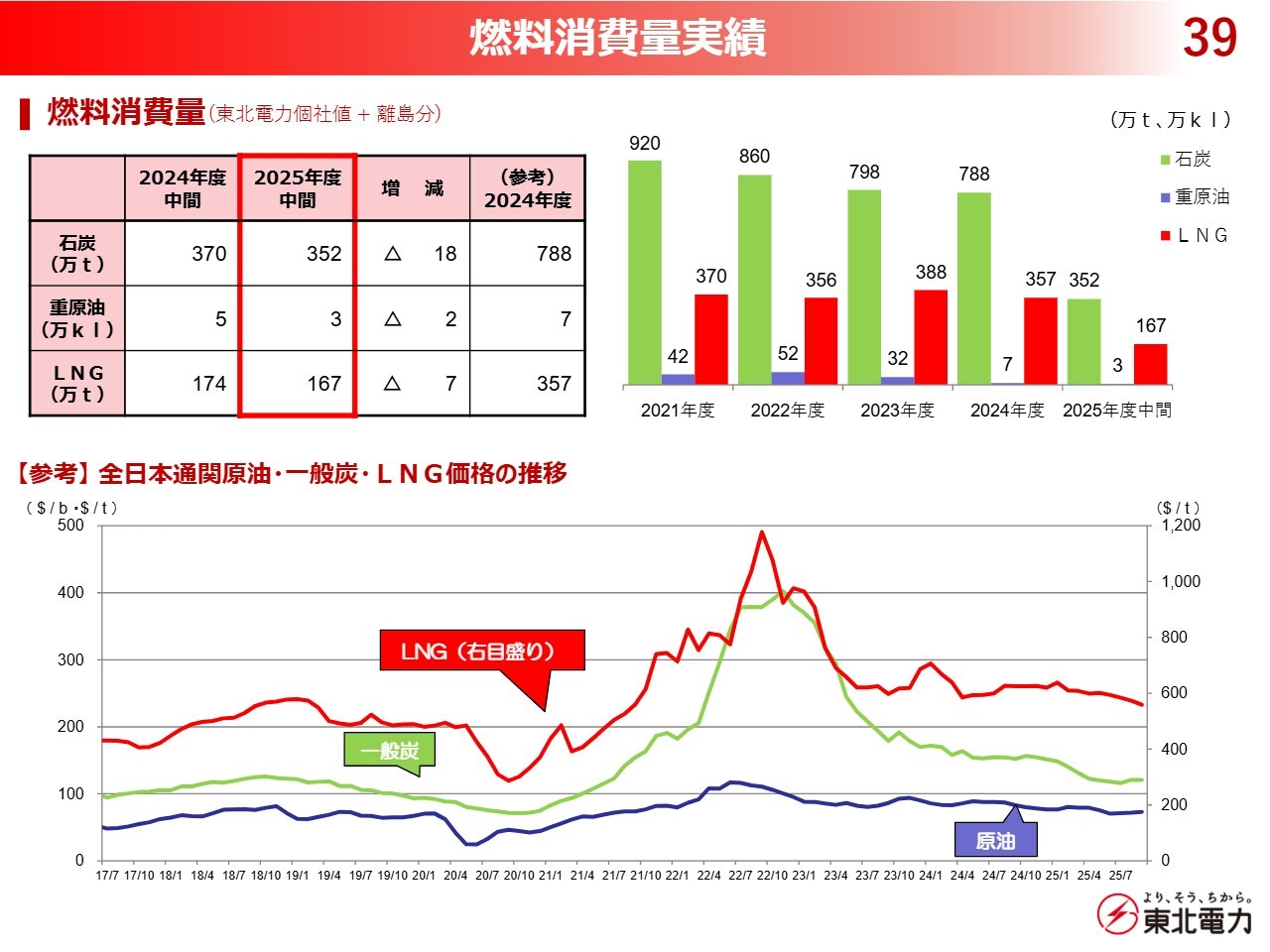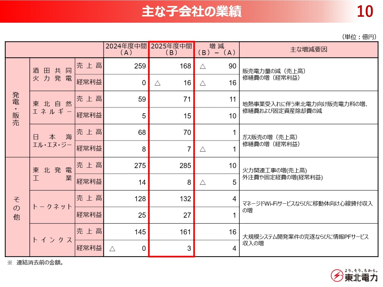 女川2号機の再稼働効果350億円や、燃料費調整制度のタイムラグ影響による差益の増加150億円などの収支改善があったものの、市場・販売環境の変化マイナス290億円や、送配電事業マイナス247億円などにより収支は悪化しました。