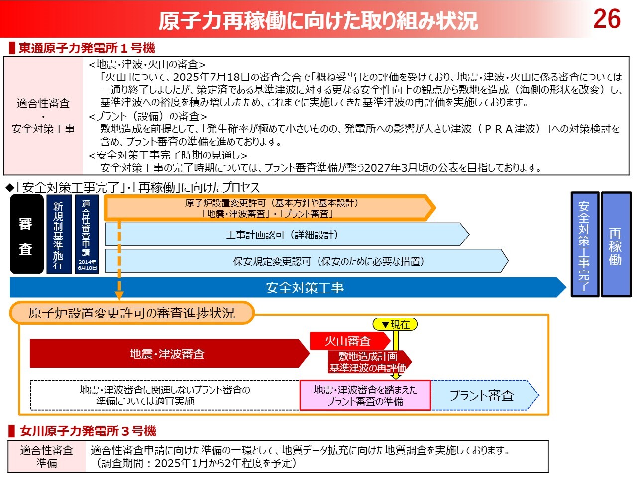 東通1号機の安全対策工事の完了時期については、プラント審査準備が整う2027年3月頃の公表を目指しています。