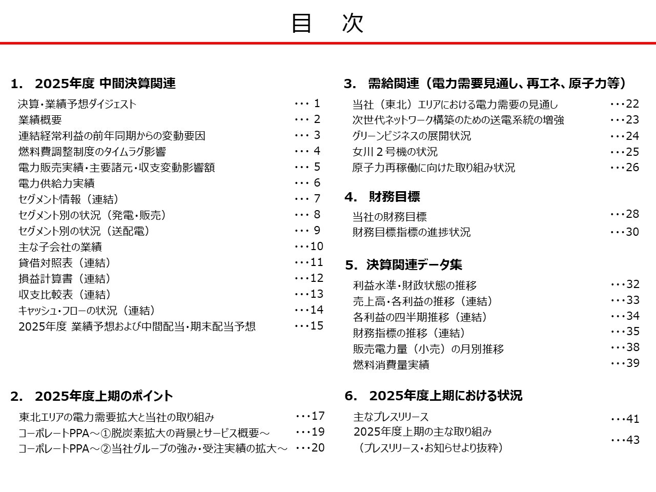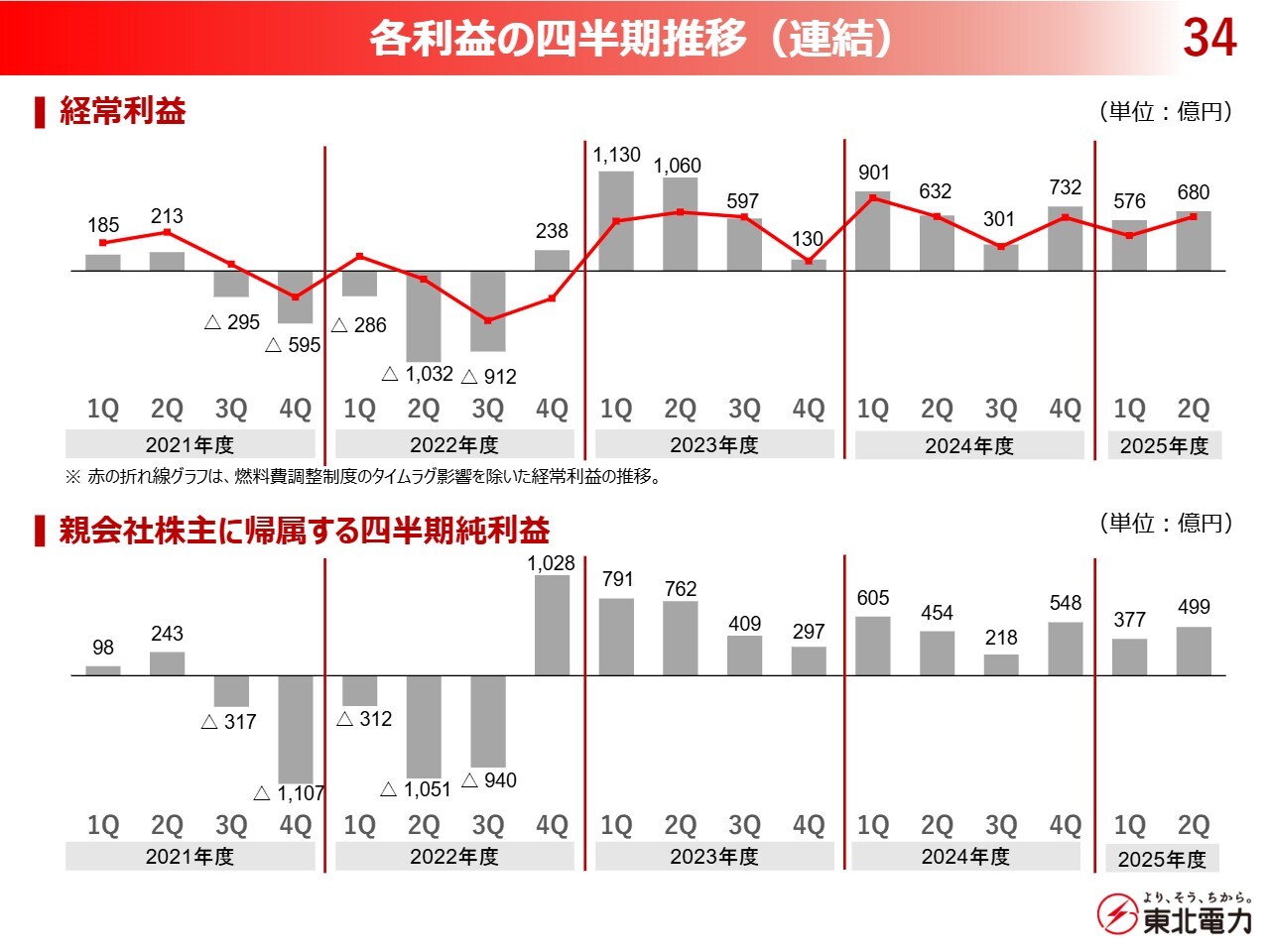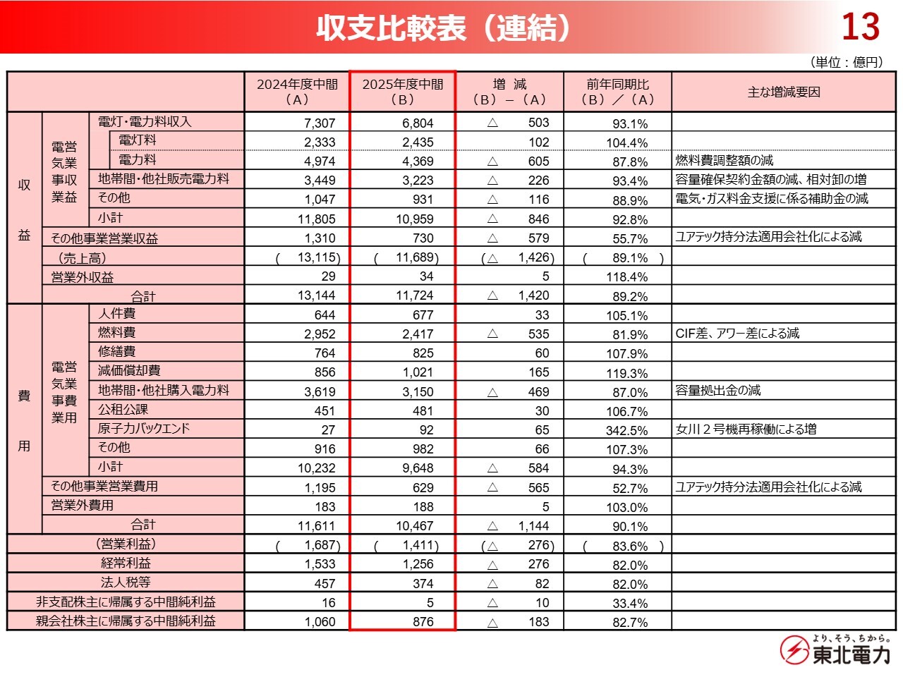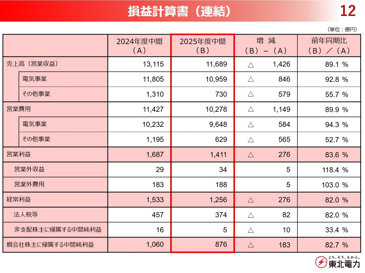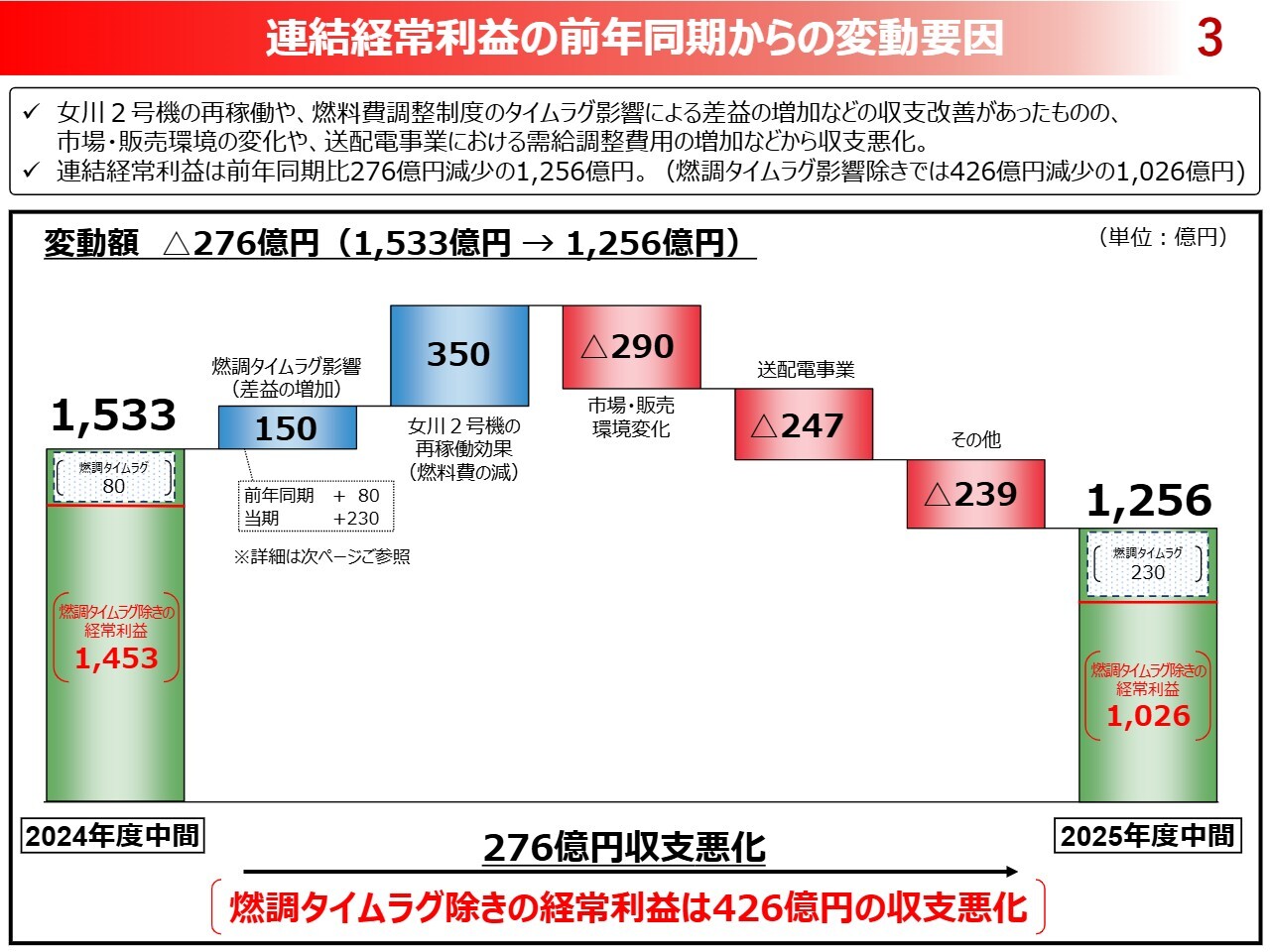 次に、経常利益については、女川2号機の再稼働や、燃料費調整制度のタイムラグ影響による差益の増加などによる収支改善があったものの、市場や販売環境の変化に伴う収支悪化や送配電事業における需給調整費用の増加などから、前年同期に比べて276億円減の1,256億円となりました。