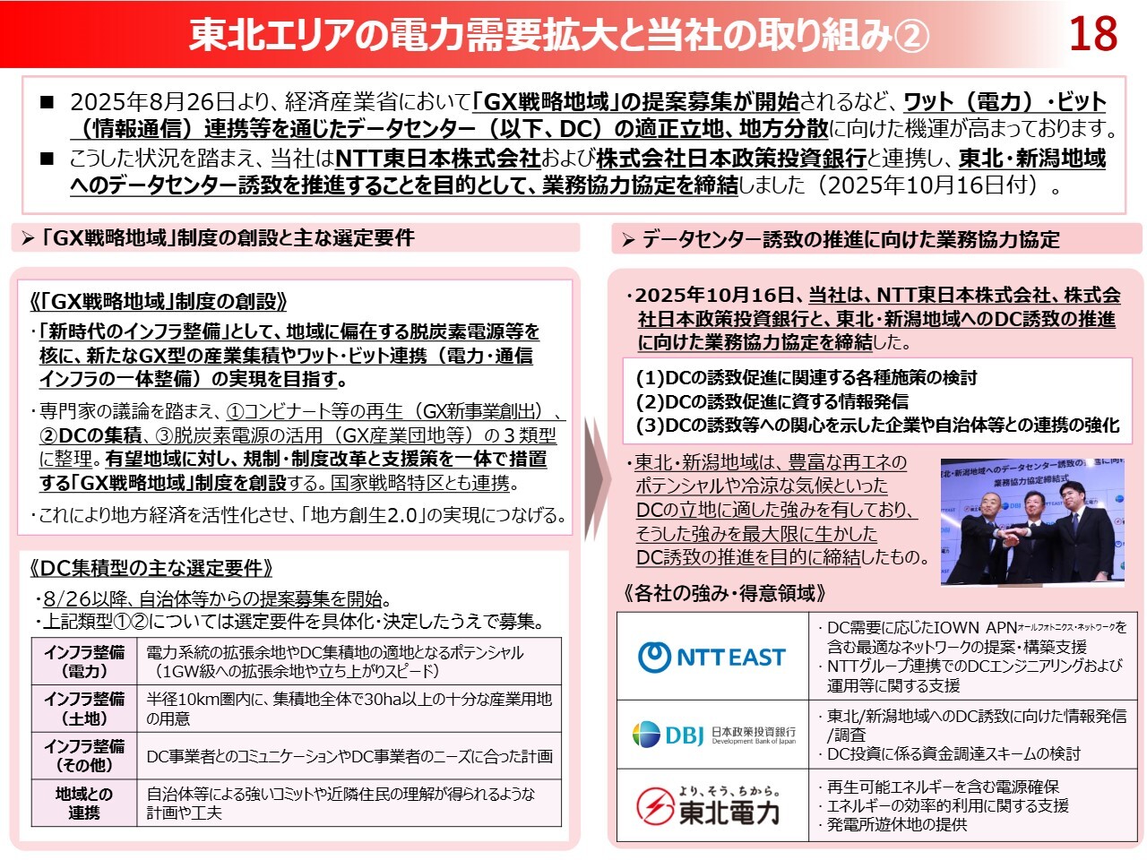 このように、ワット(電力)・ビット(情報通信)連携等を通じたデータセンターの適正立地、地方分散に向けた機運が高まっていることを踏まえ、10月16日、当社は、NTT東日本株式会社さま、株式会社日本政策投資銀行さまと東北・新潟地域の強みを最大限に生かしたデータセンターの誘致を推進することを目的とした業務協力協定を締結しました。