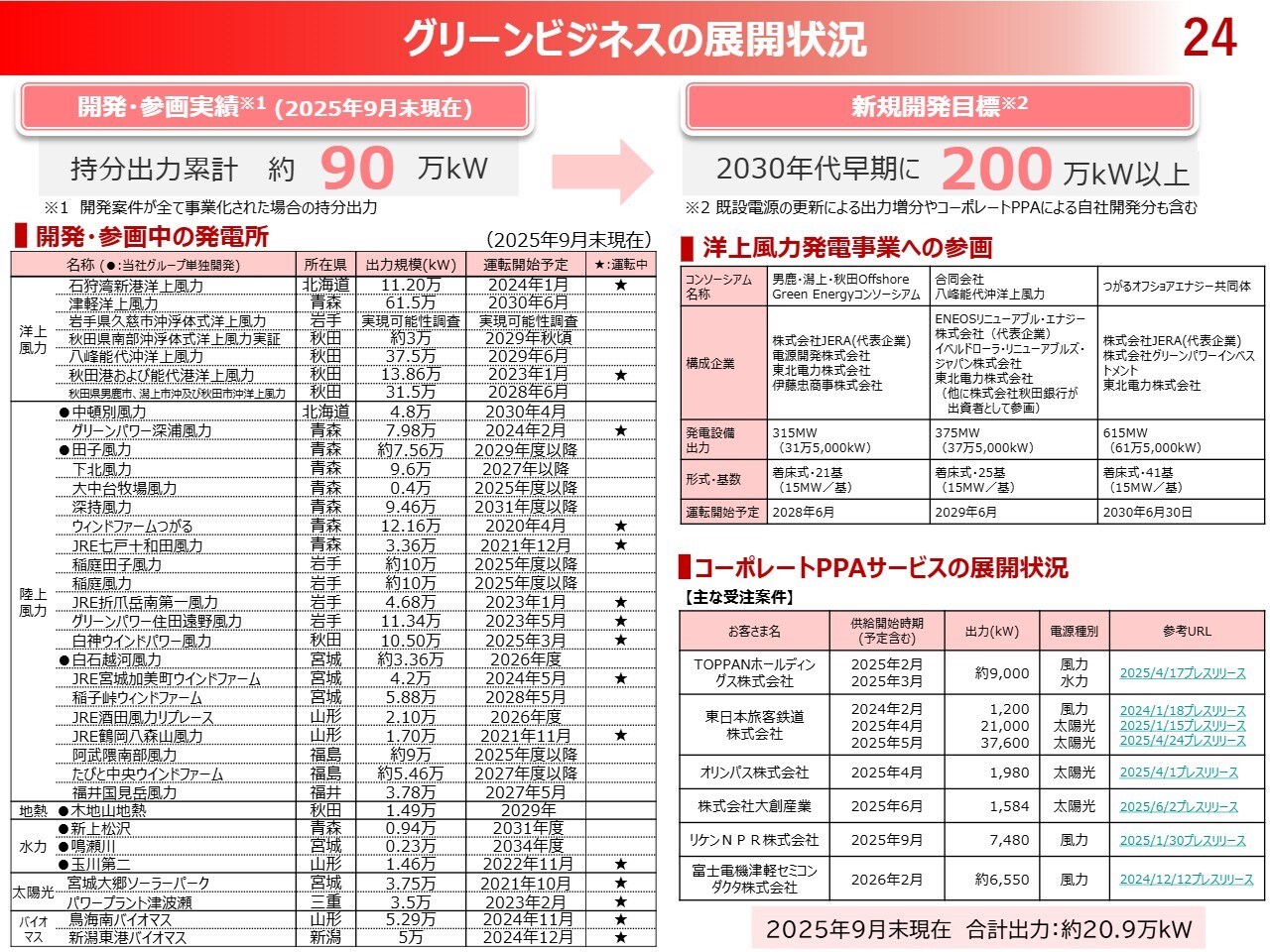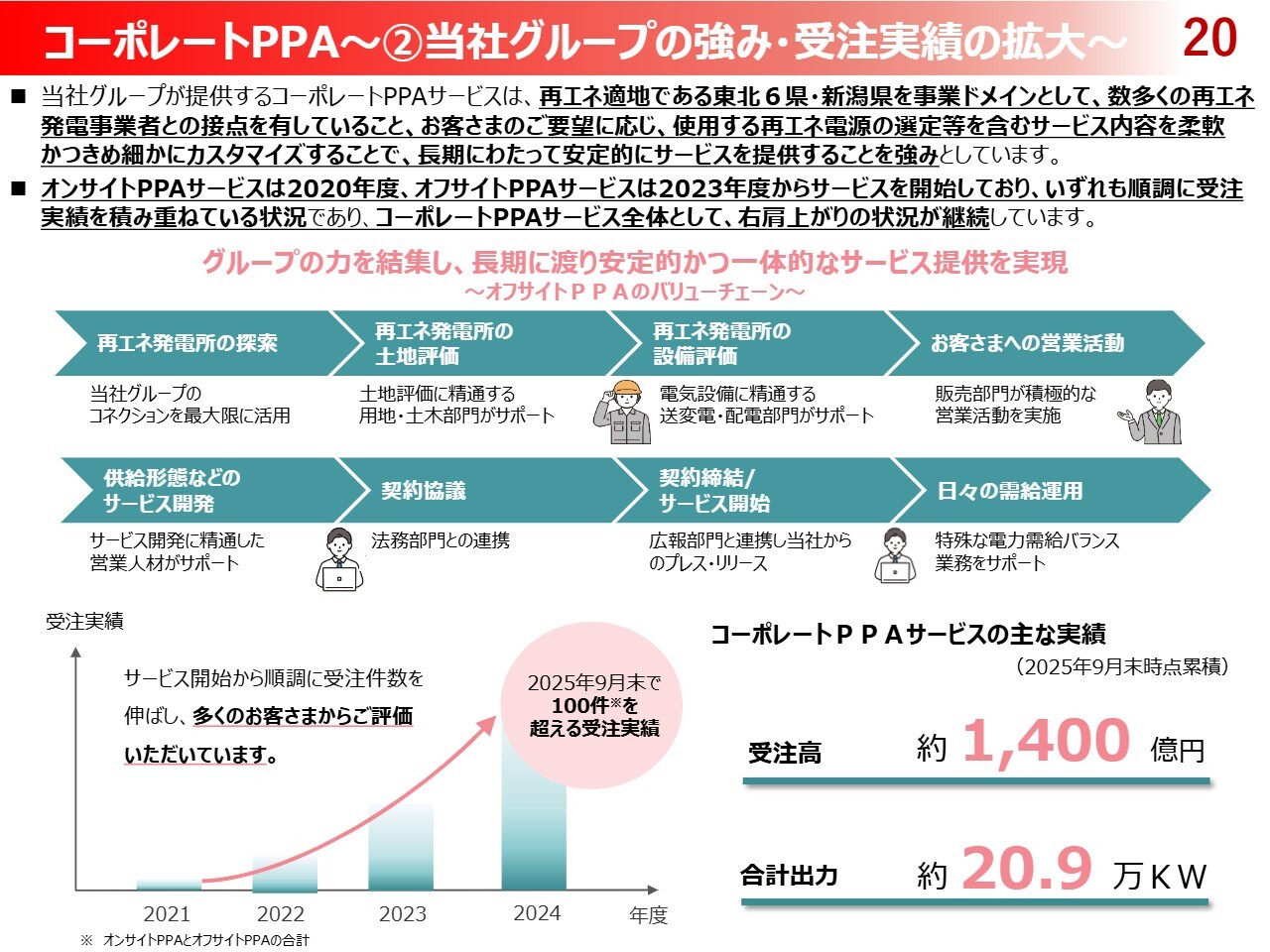 また、前段でご紹介したコーポレートPPAサービスの具体的な展開状況について、右下の表で示しています。2025年9月末時点で、合計出力約20.9万キロワットとなり、多くのお客さまに当社サービスを導入いただいています。