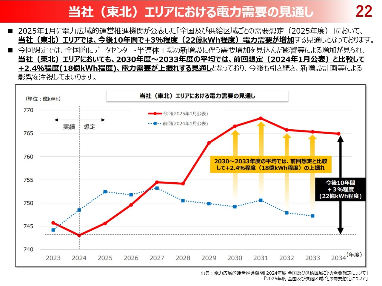 2025年1月に電力広域的運営推進機関が公表した「全国及び供給区域ごとの需要想定(2025年度)」において、当社(東北)エリアでは、今後10年間でプラス3パーセント程度(22億キロワットアワー程度)電力需要が増加する見通しとなっています。