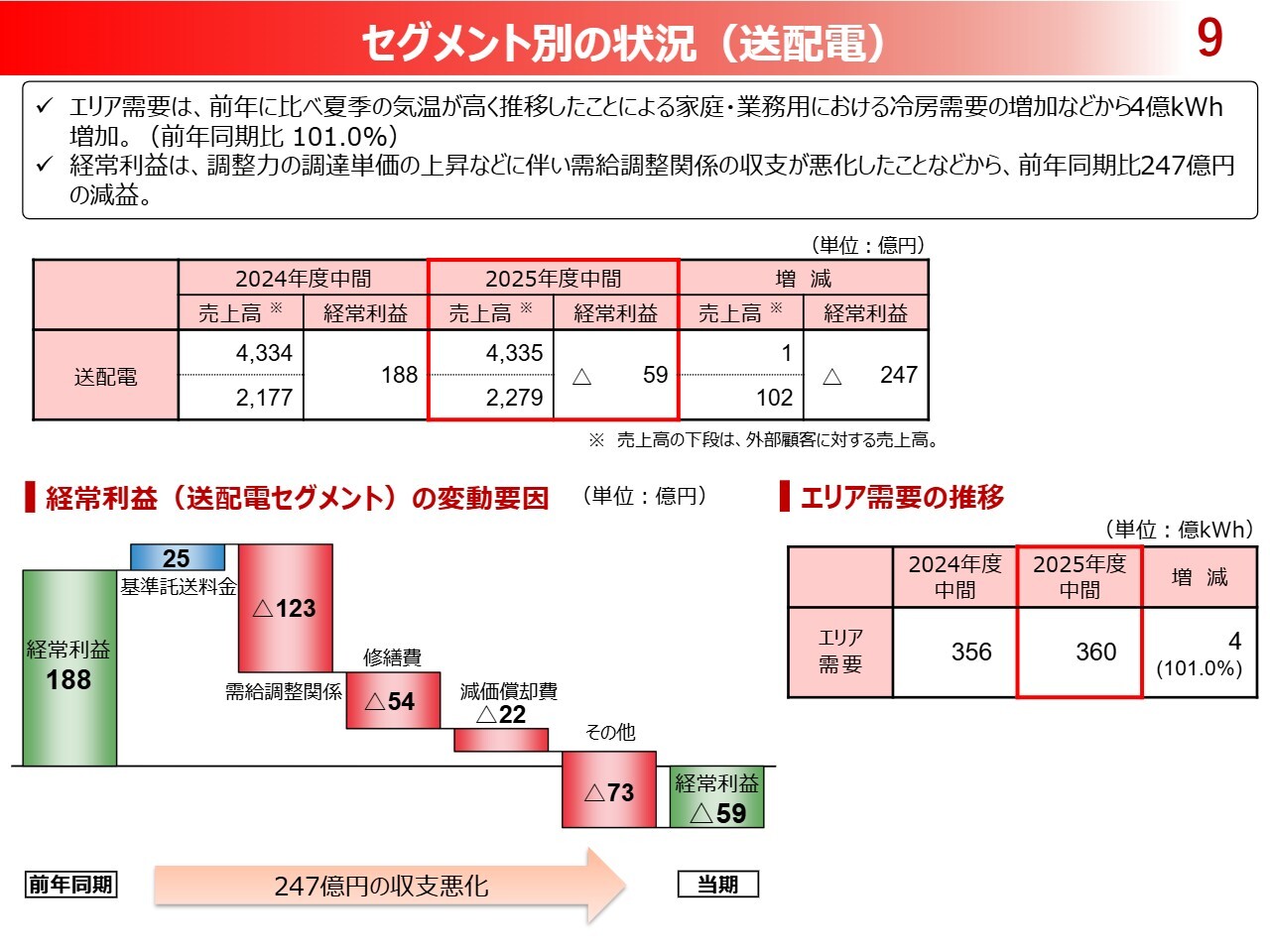送配電セグメントでは、調整力の調達単価の上昇などに伴い需給調整関係の収支が悪化したことなどから、前年同期比247億円の減益となりました。
