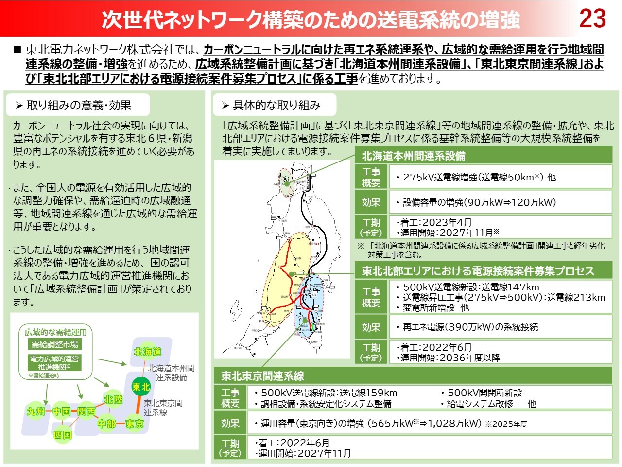 東北電力ネットワーク株式会社では、カーボンニュートラルに向けた再エネ系統連系や、広域的な需給運用を行う地域間連系線の整備・増強を進めるため、広域系統整備計画に基づき「北海道本州間連系設備」、「東北東京間連系線」および「東北北部エリアにおける電源接続案件募集プロセス」に係る工事を進めています。各工事の詳細については、資料をご覧ください。