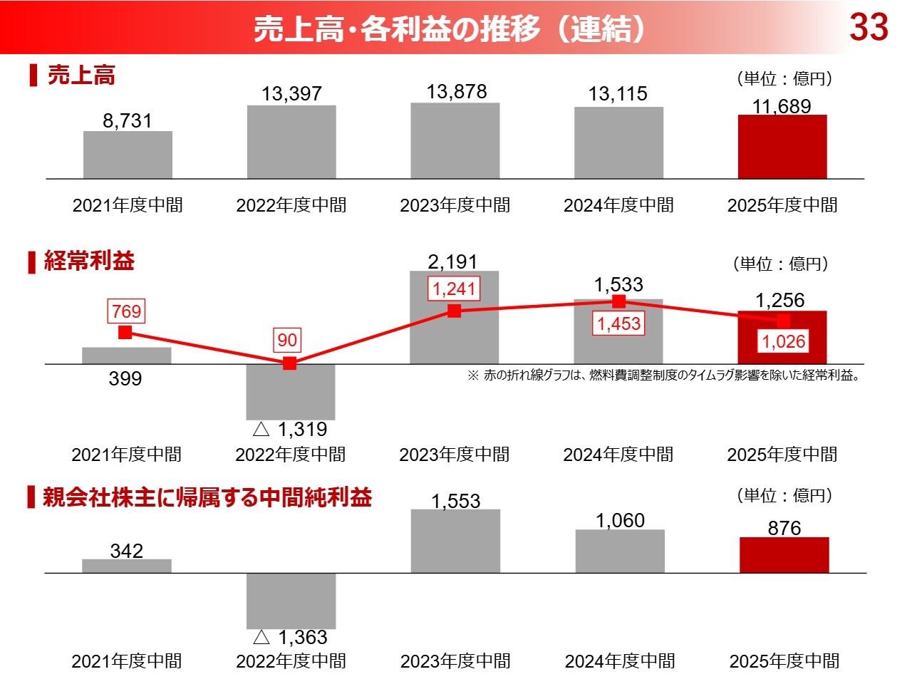 結果として、連結経常利益は前年同期比276億円減少の1,256億円(燃調タイムラグ影響除きでは426億円減少の1,026億円)となっています。