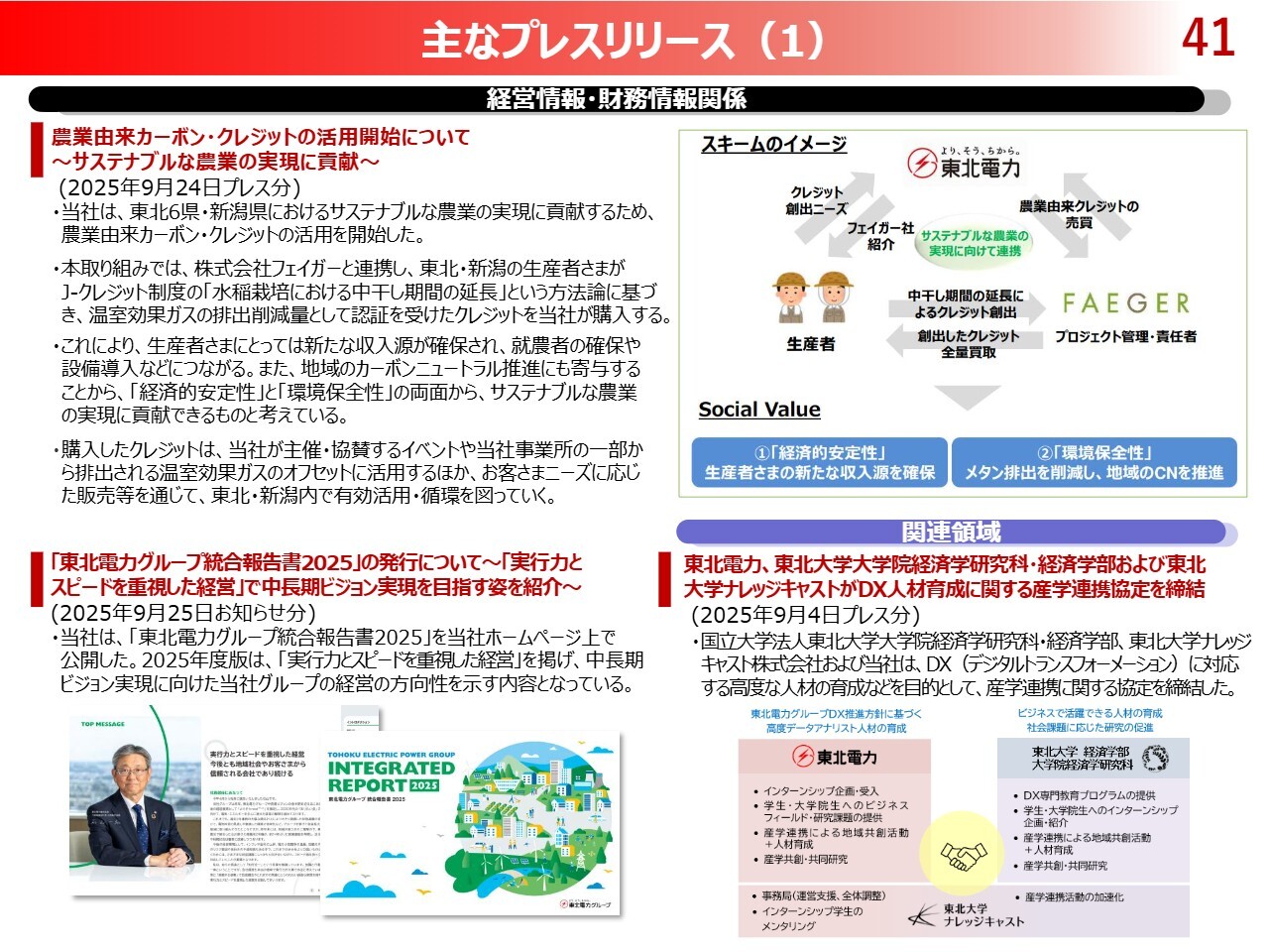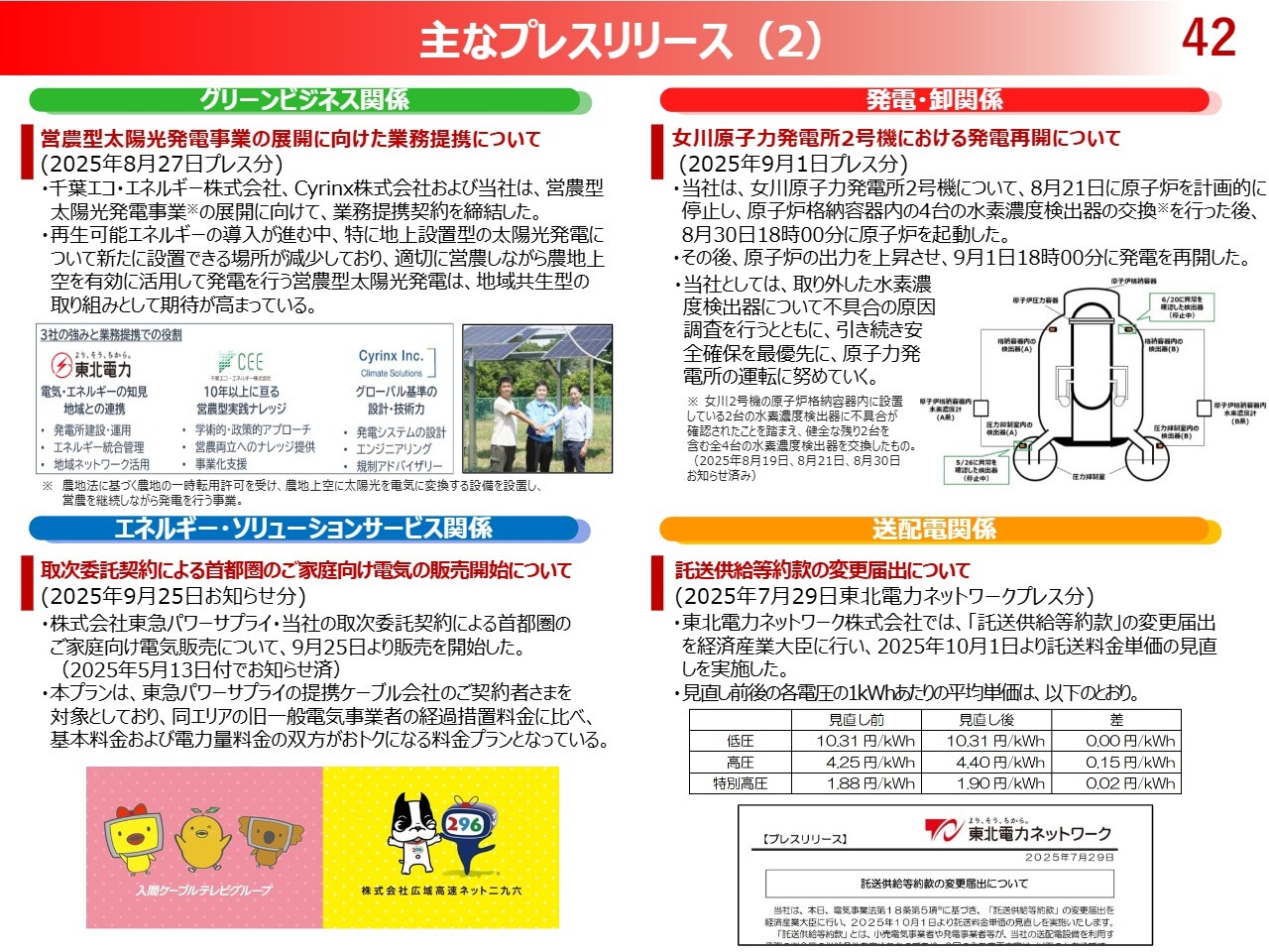 こちらのページでは、「営農型太陽光発電事業の展開に向けた業務提携」や、「中間停止していた女川2号機における発電再開」、「東北電力ネットワークにおける託送供給等約款の変更届出」について記載しています。また、「取次委託契約による首都圏のご家庭向け電気の販売開始」についてもご紹介していますので、ご覧ください。