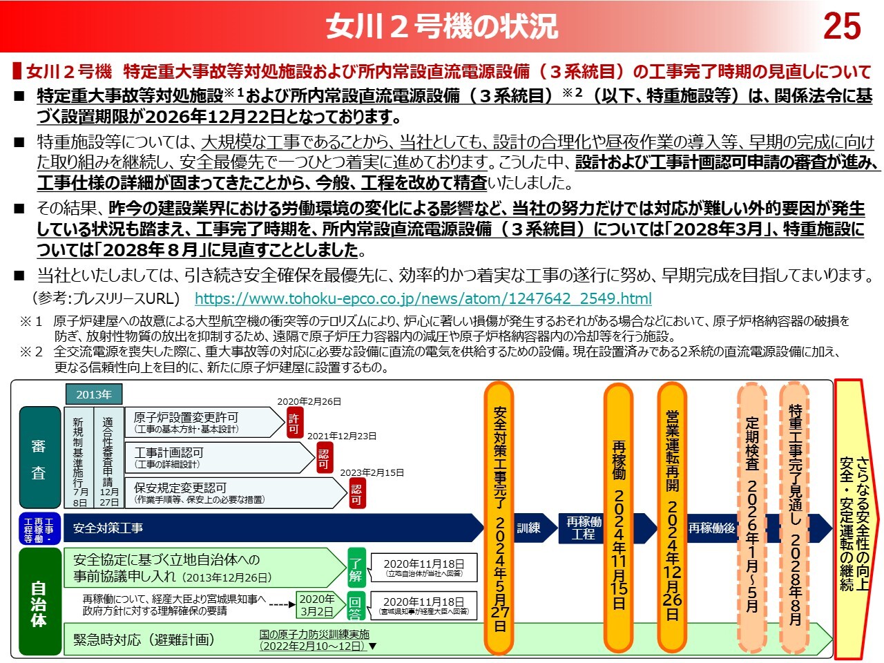 当社は、女川2号機の特重施設について、関係法令に基づく設置期限である2026年12月22日までの工事完了を目指し、工程の短縮などに最大限取り組んできましたが、今般、工事完了時期を2028年8月に見直すこととしました。
