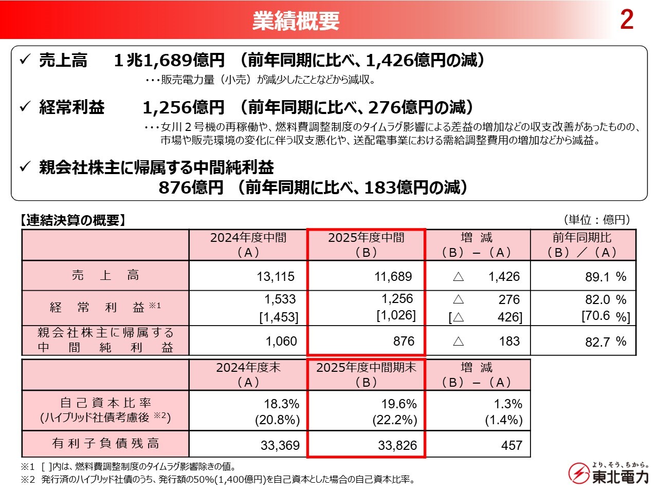 売上高については、小売の販売電力量が減少したことなどから、前年同期に比べて1,426億円減の1兆1,689億円となりました。