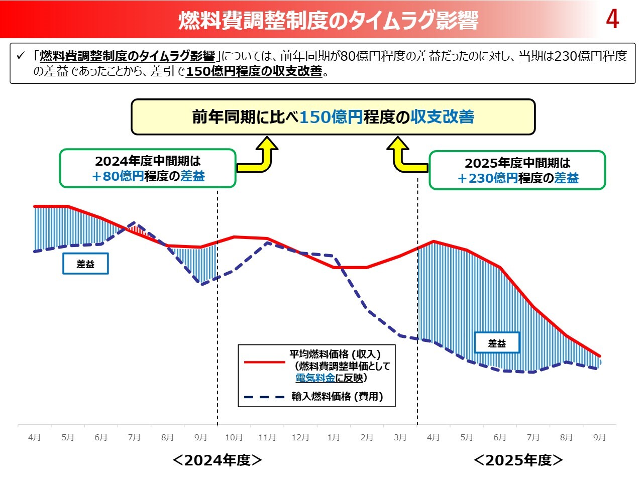 燃料費調整制度のタイムラグ影響については、前年同期が80億円程度の差益だったのに対し、当期は230億円程度の差益であったことから、差引で150億円程度の収支改善となりました。