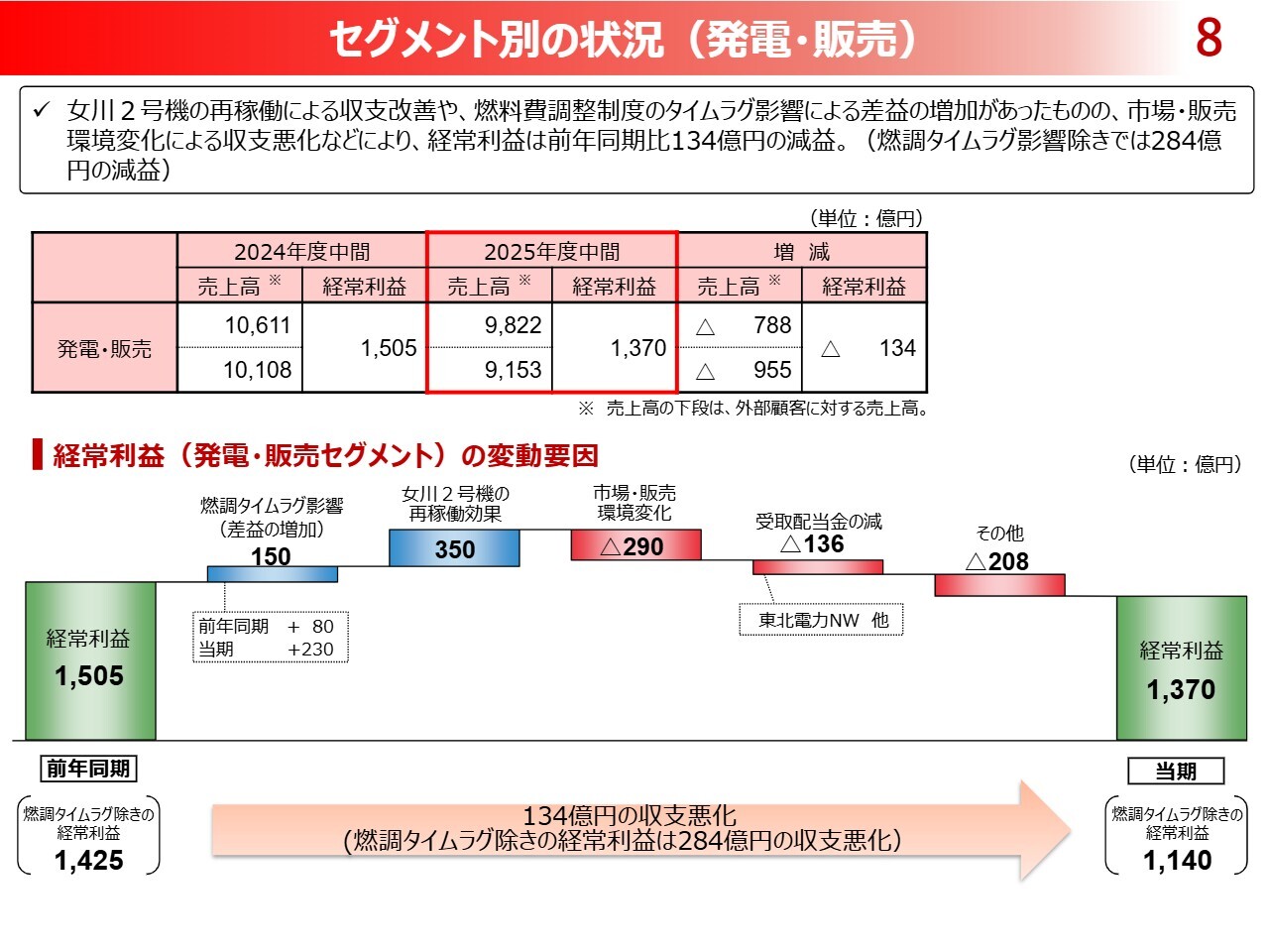 発電・販売セグメントでは、女川2号機の再稼働による収支改善や、燃料費調整制度のタイムラグ影響による差益の増加があったものの、市場・販売環境変化による収支悪化などにより、経常利益は前年同期比134億円(燃調タイムラグ影響除きでは284億円)の減益となりました。