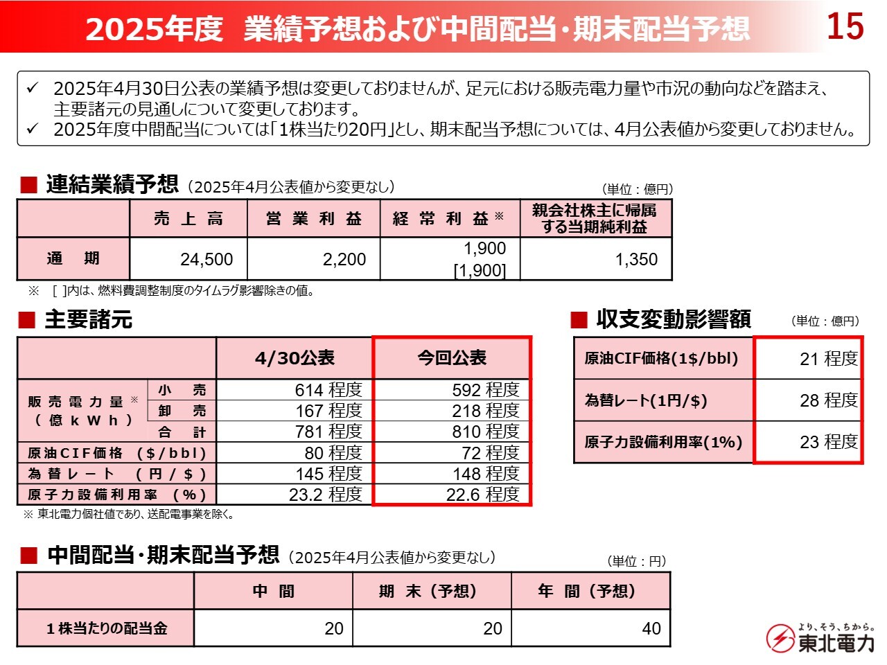 2025年度の業績予想および期末配当予想については、4月に公表した数値から変更していませんが、足元の動向を踏まえ、主要諸元の見通しのみ変更しています。
