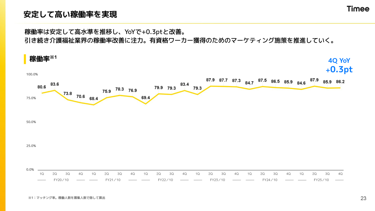 また、介護福祉分野では、主にワーカーマーケティングを活用し、有資格者の数を増やす施策を実施しています。その結果、稼働率が着実に上昇し、売上増加につながることを上限の重要な要素として考えています。