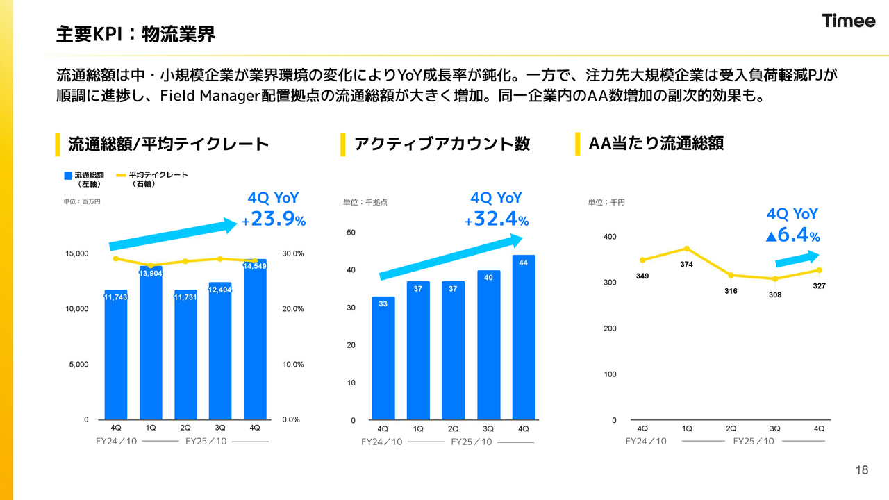 アクティブアカウント数も、着実に成長しています。また、アクティブアカウント当たり流通総額については物流のポートフォリオ割合が大きくなっている影響もあり、前年同期比1.2パーセントのプラスとなっており、第3四半期から継続してプラスを維持しています。