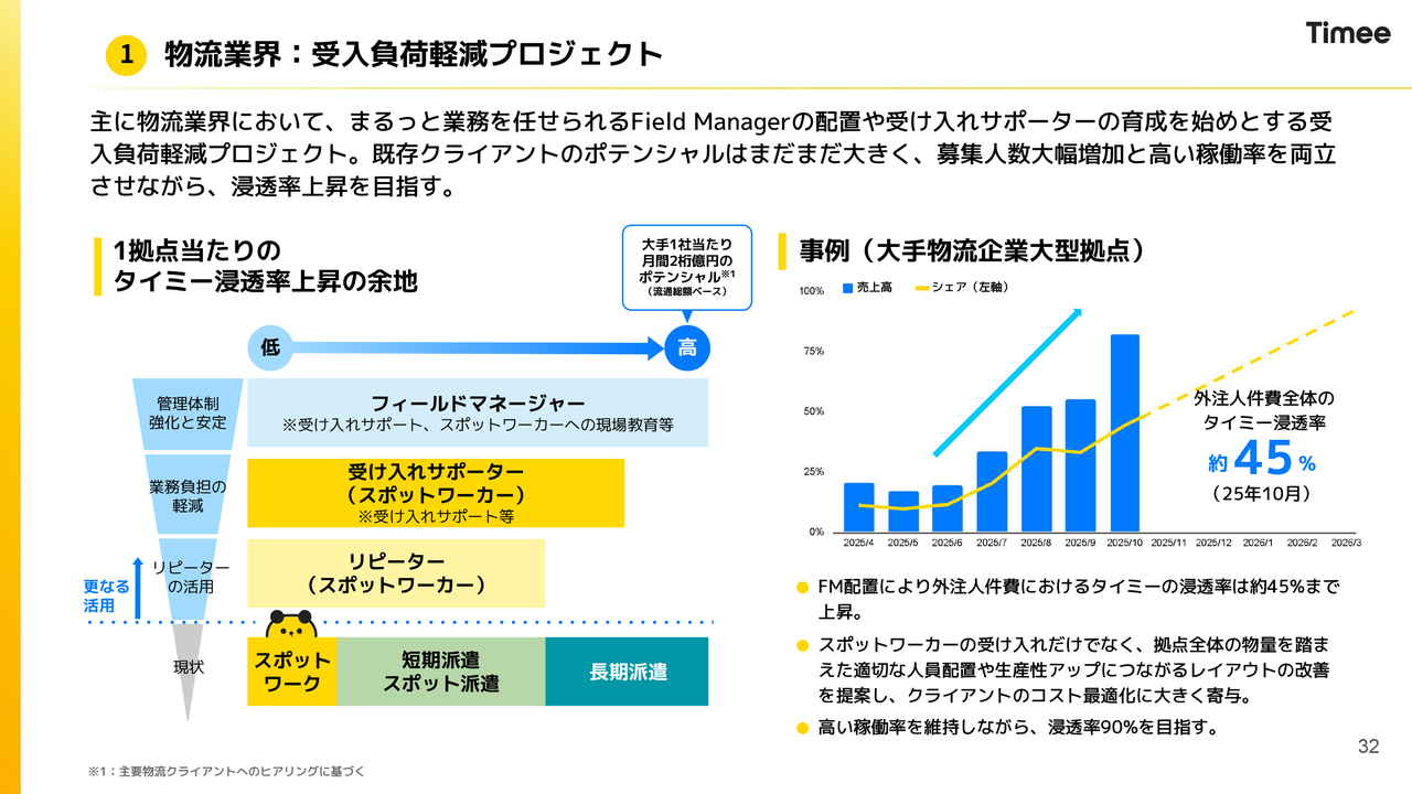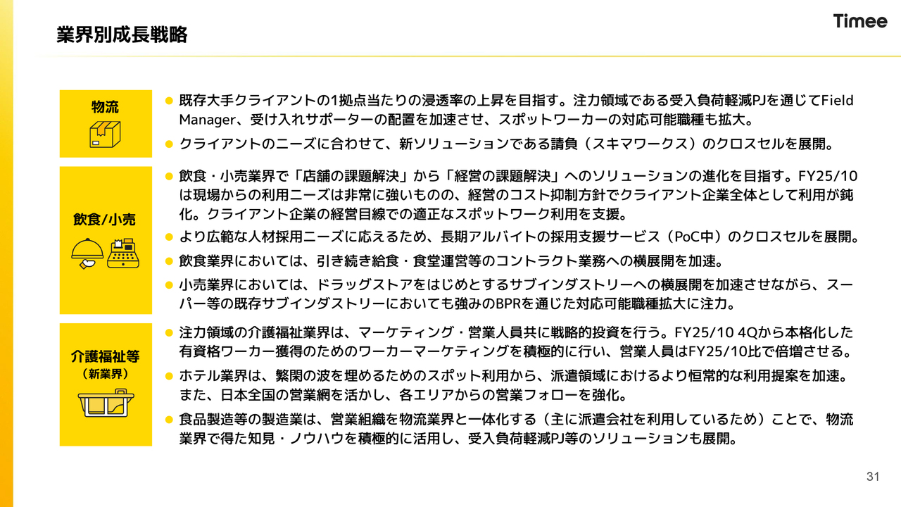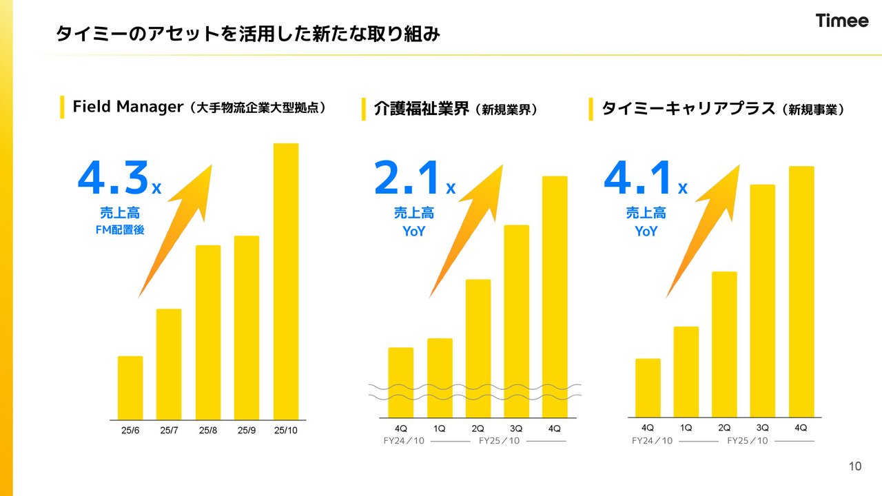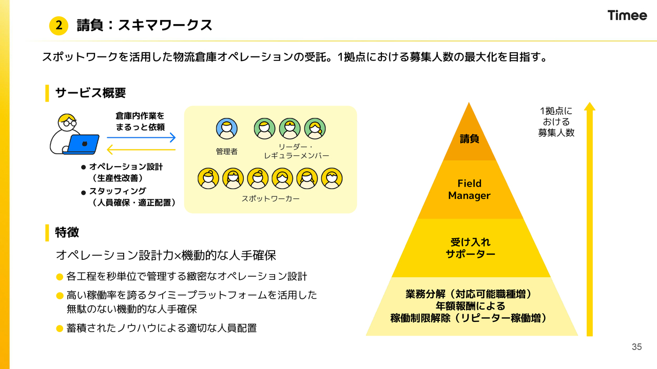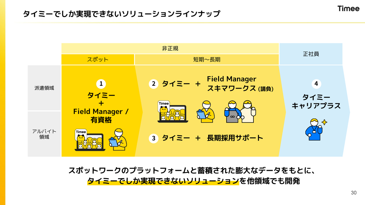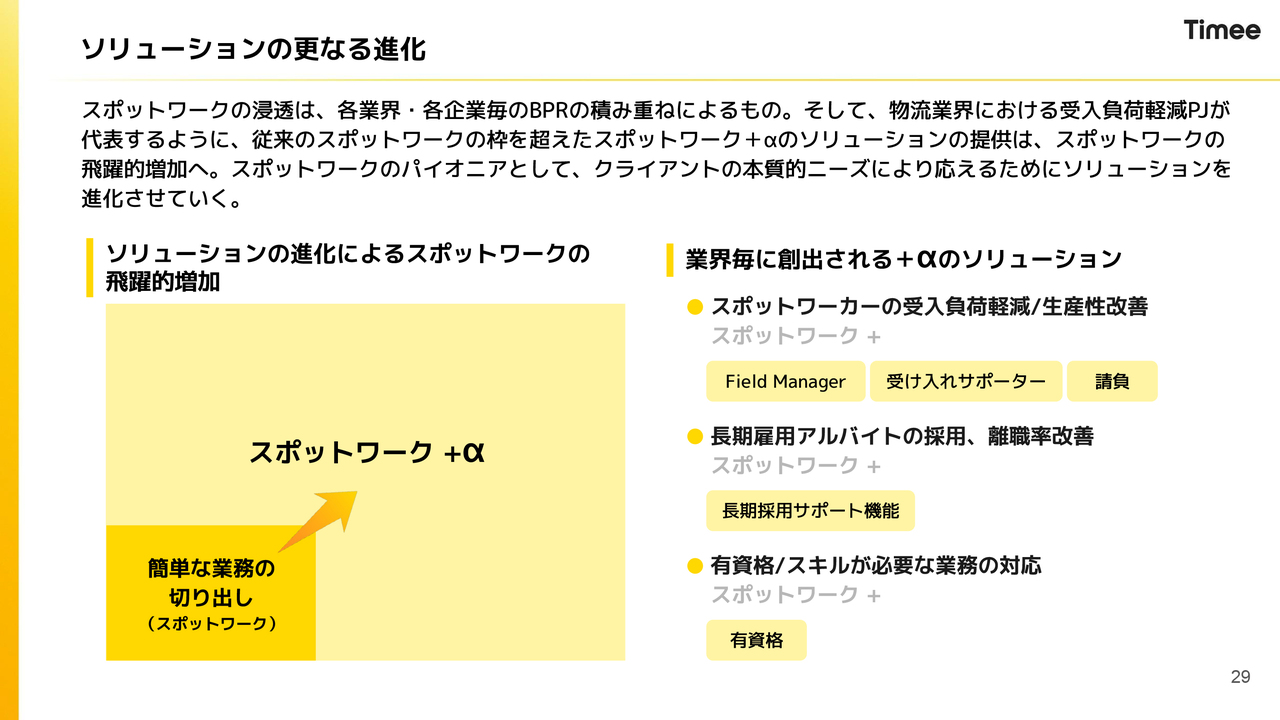 「Field Manager」は以前からご説明しているように、大手物流企業の拠点に当社社員を派遣し、タイミーに登録された方々を束ねていくことで、大手物流企業での利用が一気に拡大しており、順調に立ち上がっています。